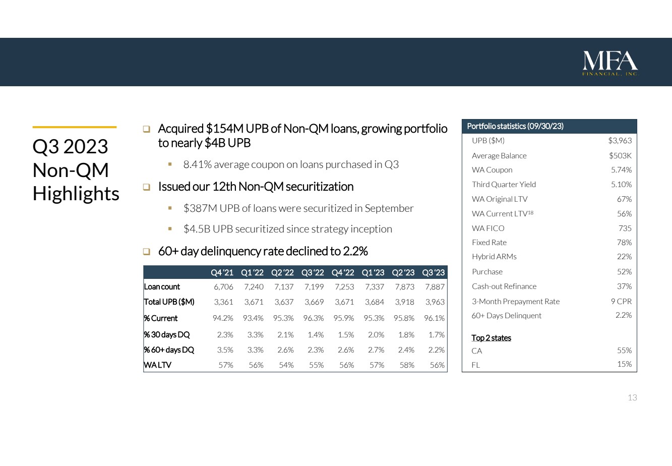 12 P ortfolio s tatistics ( 09 /3 0 /2 3 ) UPB ($M) $1,668 Average Balance $249K WA Coupon 6. 22% Third Quarter Yield 5.88% WA Original LTV 70% WA Current LTV 7 62% WA FICO 737 WA DSCR 20 1.48x WA Loan Age (Months) 20 Hybrid ARMs 25% 3 - Month Prepayment Rate 6 CPR 60+ Days Delinquent 3.8% Top 2 states FL 11% GA 9% Q3 2023 SFR Loan Highlights □ Single - family rental (SFR) loan portfolio grew by 4% and continues to perform well ▪ Lima One originated $97M of SFR loans with average LTV of 69% and average FICO score of 737 ▪ 8.41% average coupon on loans originated in Q3 □ 90% of SFR loan financing is non - MTM □ Issued our 7 th SFR loan securitization ▪ $215M UPB of loans were securitized in September ▪ $1.6B UPB securitized since 2021 □ 3 - month prepayment rate remained flat at 6 CPR □ 60+ day delinquency rate rose to 3.8%