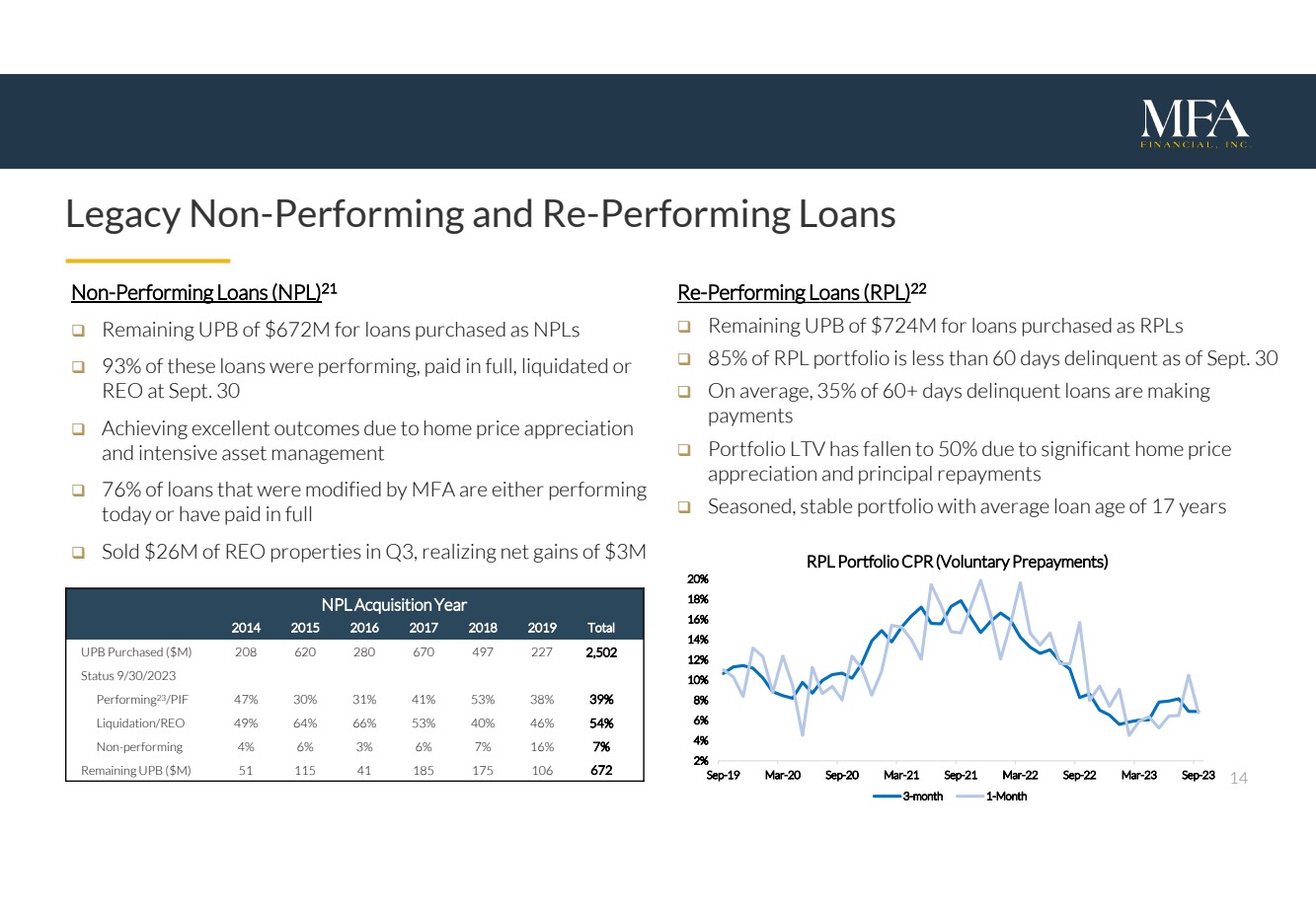 13 Q4 ‘21 Q1 ‘22 Q2 ‘22 Q3 ‘22 Q4 ‘22 Q1 ‘23 Q2 ‘23 Q3 ‘23 Loan count 6,706 7,240 7,137 7,199 7,253 7,337 7,873 7,887 Total UPB ($M) 3,361 3,671 3,637 3,669 3,671 3,684 3,918 3,963 % Current 94.2% 93.4% 95.3% 96.3% 95.9% 95.3% 95.8% 96.1% % 30 days DQ 2.3% 3.3% 2.1% 1.4% 1.5% 2.0% 1.8% 1.7% % 60+ days DQ 3.5% 3.3% 2.6% 2.3% 2.6% 2.7% 2.4% 2.2% WA LTV 57% 56% 54% 55% 56% 57% 58% 56% Q3 2023 Non - QM Highlights □ Acquired $154M UPB of Non - QM loans, growing portfolio to nearly $4B UPB ▪ 8.41% average coupon on loans purchased in Q3 □ Issued our 12th Non - QM securitization ▪ $387M UPB of loans were securitized in September ▪ $4.5B UPB securitized since strategy inception □ 60+ day delinquency rate declined to 2.2% P ortfolio s tatistics ( 09/30/ 2 3 ) UPB ($M) $3,963 Average Balance $503K WA Coupon 5.74% Third Quarter Yield 5.10% WA Original LTV 67 % WA Current LTV 18 56% WA FICO 73 5 Fixed Rate 78% Hybrid ARMs 22% Purchase 5 2 % Cash - o ut R efinance 3 7 % 3 - Month Prepayment Rate 9 CPR 60+ Days Delinquent 2.2% Top 2 states CA 55% FL 15%