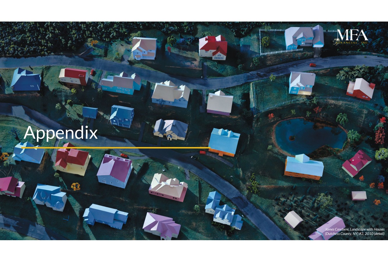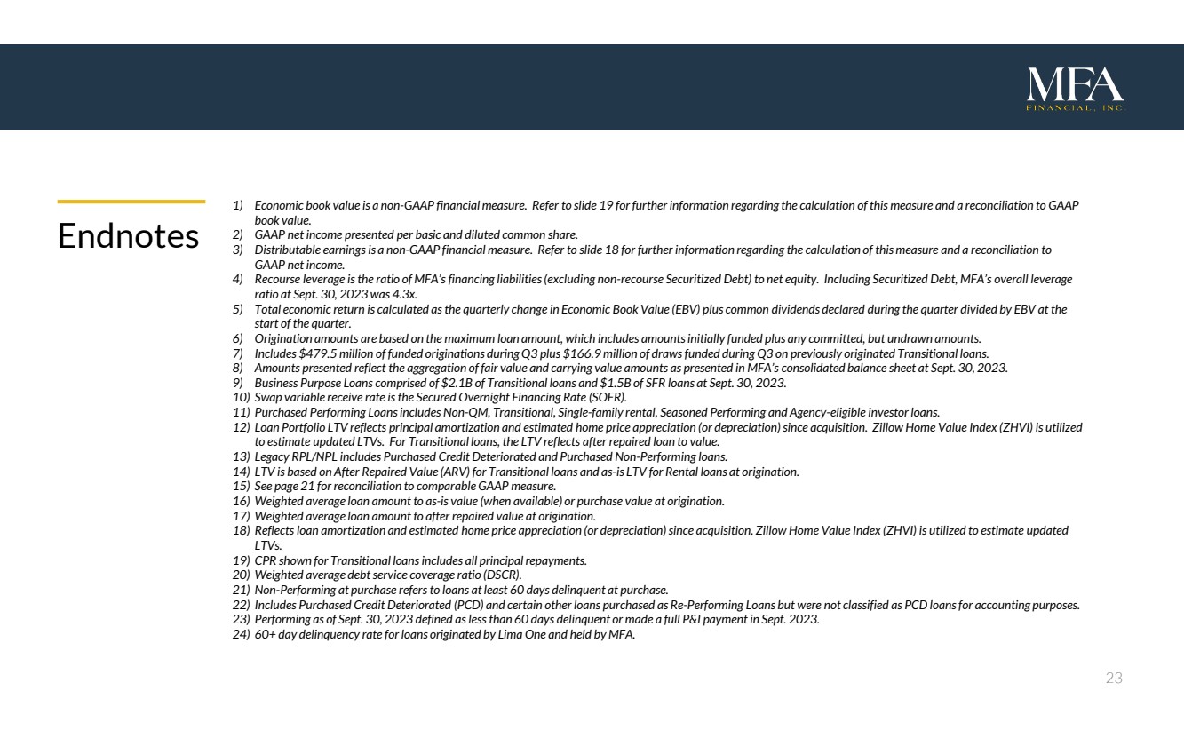 23 Endnotes 1) Economic book value is a non - GAAP financial measure. Refer to slide 19 for further information regarding the calculation of this measure and a reco nciliation to GAAP book value. 2) GAAP net income presented per basic and diluted common share. 3) Distributable earnings is a non - GAAP financial measure. Refer to slide 18 for further information regarding the calculation of this measure and a reconciliation to GAAP net income. 4) Recourse leverage is the ratio of MFA’s financing liabilities (excluding non - recourse Securitized Debt) to net equity. Includin g Securitized Debt, MFA’s overall leverage ratio at Sept. 30, 2023 was 4.3x. 5) Total economic return is calculated as the quarterly change in Economic Book Value (EBV) plus common dividends declared durin g t he quarter divided by EBV at the start of the quarter. 6) Origination amounts are based on the maximum loan amount, which includes amounts initially funded plus any committed, but und raw n amounts. 7) Includes $479.5 million of funded originations during Q3 plus $166.9 million of draws funded during Q3 on previously originat ed Transitional loans. 8) Amounts presented reflect the aggregation of fair value and carrying value amounts as presented in MFA’s consolidated balance sh eet at Sept. 30, 2023. 9) Business Purpose Loans comprised of $2.1B of Transitional loans and $1.5B of SFR loans at Sept. 30, 2023. 10) Swap variable receive rate is the Secured Overnight Financing Rate (SOFR). 11) Purchased Performing Loans includes Non - QM, Transitional, Single - family rental, Seasoned Performing and Agency - eligible investor loans. 12) Loan Portfolio LTV reflects principal amortization and estimated home price appreciation (or depreciation) since acquisition. Z illow Home Value Index (ZHVI) is utilized to estimate updated LTVs. For Transitional loans, the LTV reflects after repaired loan to value. 13) Legacy RPL/NPL includes Purchased Credit Deteriorated and Purchased Non - Performing loans. 14) LTV is based on After Repaired Value (ARV) for Transitional loans and as - is LTV for Rental loans at origination. 15) See page 21 for reconciliation to comparable GAAP measure. 16) Weighted average loan amount to as - is value (when available) or purchase value at origination. 17) Weighted average loan amount to after repaired value at origination. 18) Reflects loan amortization and estimated home price appreciation (or depreciation) since acquisition. Zillow Home Value Index (Z HVI) is utilized to estimate updated LTVs. 19) CPR shown for Transitional loans includes all principal repayments. 20) Weighted average debt service coverage ratio (DSCR). 21) Non - Performing at purchase refers to loans at least 60 days delinquent at purchase. 22) Includes Purchased Credit Deteriorated (PCD) and certain other loans purchased as Re - Performing Loans but were not classified as PCD loans for accounting purposes. 23) Performing as of Sept. 30, 2023 defined as less than 60 days delinquent or made a full P&I payment in Sept. 2023. 24) 60+ day delinquency rate for loans originated by Lima One and held by MFA.
