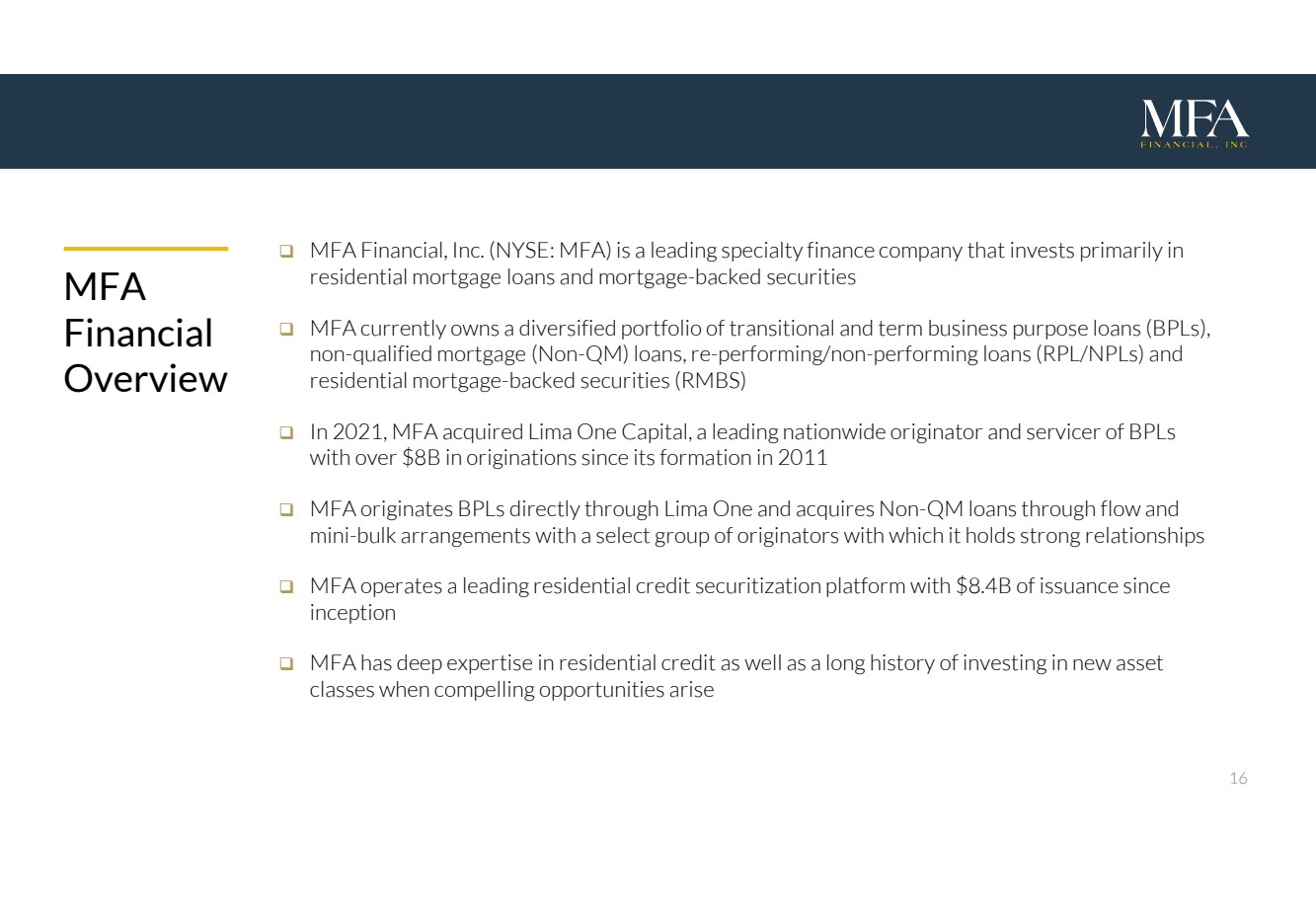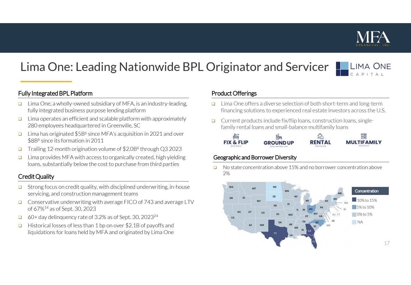 16 MFA Financial Overview □ MFA Financial, Inc. (NYSE: MFA) is a leading specialty finance company that invests primarily in residential mortgage loans and mortgage - backed securities □ MFA currently owns a diversified portfolio of transitional and term business purpose loans (BPLs), non - qualified mortgage (Non - QM) loans, re - performing/non - performing loans (RPL/NPLs) and residential mortgage - backed securities (RMBS) □ In 2021, MFA acquired Lima One Capital, a leading nationwide originator and servicer of BPLs with over $8B in originations since its formation in 2011 □ MFA originates BPLs directly through Lima One and acquires Non - QM loans through flow and mini - bulk arrangements with a select group of originators with which it holds strong relationships □ MFA operates a leading residential credit securitization platform with $8.4B of issuance since inception □ MFA has deep expertise in residential credit as well as a long history of investing in new asset classes when compelling opportunities arise