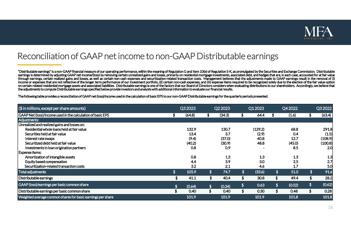 18 Reconciliation of GAAP net income to non - GAAP Distributable earnings “Distributable earnings” is a non - GAAP financial measure of our operating performance, within the meaning of Regulation G and Item 10 (e) of Regulation S - K, as promulgated by the Securities and Exchange Commission . Distributable earnings is determined by adjusting GAAP net income/(loss) by removing certain unrealized gains and losses, primarily on residential mortgage investments, associated debt, and hedges that are, in each case, accounted for at fair value through earnings, certain realized gains and losses, as well as certain non - cash expenses and securitization - related transaction costs . Management believes that the adjustments made to GAAP earnings result in the removal of ( i ) income or expenses that are not reflective of the longer term performance of our investment portfolio, (ii) certain non - cash expenses, and (iii) expense items required to be recognized solely due to the election of the fair value option on certain related residential mortgage assets and associated liabilities . Distributable earnings is one of the factors that our Board of Directors considers when evaluating distributions to our shareholders . Accordingly, we believe that the adjustments to compute Distributable earnings specified below provide investors and analysts with additional information to evaluate our financial results . The following table provides a reconciliation of GAAP net (loss)/income used in the calculation of basic EPS to our non - GAAP Distributable earnings for the quarterly periods presented . ( $ i n m illions, e xcept p er s hare a mounts) Q3 202 3 Q2 202 3 Q 1 202 3 Q 4 2022 Q 3 2022 GAAP Net (loss)/income used in the calculation of basic EPS $ (64.8) $ (34.3) $ 64.4 $ (1.6) $ ( 63.4 ) Adjustments: Unrealized and realized gains and losses on: Residential whole loans held at fair value 132.9 130.7 (129.2) 68.8 291.8 Securities held at fair value 13.4 3.7 (2.9) 0.4 ( 1.5 ) Interest rate swaps (9.4) (37.0) 40.8 12.7 ( 108 . 9 ) Securitized debt held at fair value (40.2) (30.9) 48.8 ( 45.0 ) ( 100 . 8 ) Investments in loan origination partners 0.8 0.9 - 8.5 2.0 Expense items: Amortization of intangible assets 0.8 1.3 1.3 1.3 1.3 Equity based compensation 4.4 3.9 3.0 2.5 2.7 Securitization - related transaction costs 3.2 2.1 4.6 1.7 5.0 Total adjustments $ 105.9 $ 74.7 $ (33.6) $ 51.0 $ 91.6 Distributable earnings $ 41.1 $ 40.4 $ 30.8 $ 49.4 $ 28.2 GAAP (loss)/earnings per basic common share $ (0.64) $ (0.34) $ 0.63 $ (0.02) $ ( 0 . 62 ) Distributable earnings per basic common share $ 0.40 $ 0.40 $ 0.30 $ 0.48 $ 0.28 Weighted average common shares for basic earnings per share 10 1 . 9 10 1 . 9 10 1 . 9 10 1 . 8 10 1 . 8