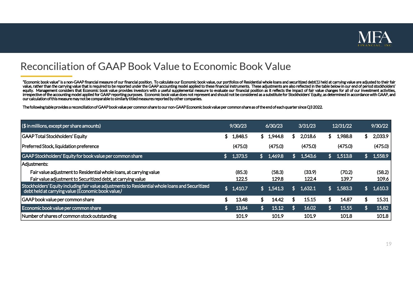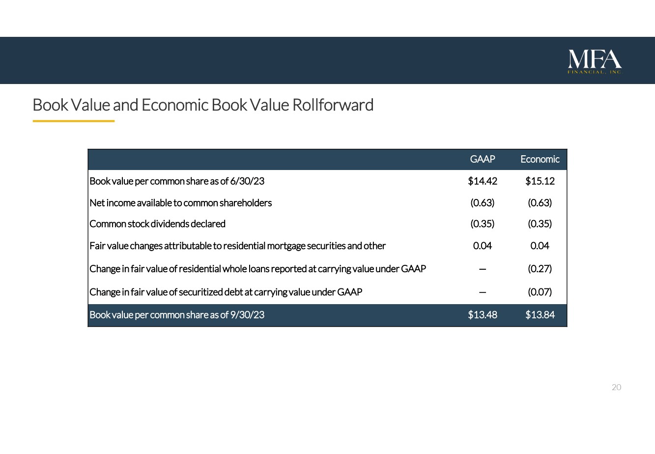 19 Reconciliation of GAAP Book Value to Economic Book Value “Economic book value” is a non - GAAP financial measure of our financial position . To calculate our Economic book value, our portfolios of Residential whole loans and securitized debt( 1 ) held at carrying value are adjusted to their fair value, rather than the carrying value that is required to be reported under the GAAP accounting model applied to these financial instruments . These adjustments are also reflected in the table below in our end of period stockholders’ equity . Management considers that Economic book value provides investors with a useful supplemental measure to evaluate our financial position as it reflects the impact of fair value changes for all of our investment activities, irrespective of the accounting model applied for GAAP reporting purposes . Economic book value does not represent and should not be considered as a substitute for Stockholders’ Equity, as determined in accordance with GAAP, and our calculation of this measure may not be comparable to similarly titled measures reported by other companies . The following table provides a reconciliation of GAAP book value per common share to our non - GAAP Economic book value per common share as of the end of each quarter since Q 3 2022 . ($ i n millions, except per share amounts) 9/30 /2 3 6/30 /2 3 3 /3 1 /2 3 12 /3 1 /22 9 /30/22 GAAP Total Stockholders’ Equity $ 1,848.5 $ 1,944.8 $ 2,018.6 $ 1,988.8 $ 2,033.9 Preferred Stock, liquidation preference (475.0) (475.0) (475.0 ) (475.0 ) (475.0 ) GAAP Stockholders’ Equity for book value per common share $ 1,373.5 $ 1,469.8 $ 1, 543.6 $ 1, 513.8 $ 1, 558 . 9 Adjustments: Fair value adjustment to Residential whole loans, at carrying value (85.3) (58.3) (33.9) (70.2) (58.2) Fair value adjustment to Securitized debt, at carrying value 122.5 129.8 122.4 139.7 109.6 Stockholders’ Equity including fair value adjustments to Residential whole loans and Securitized debt held at carrying value (Economic book value ) $ 1,410.7 $ 1,541.3 $ 1,632.1 $ 1,583.3 $ 1,610.3 GAAP book value per common share $ 13.48 $ 14.42 $ 15.15 $ 14.87 $ 15.31 Economic book value per common share $ 13.84 $ 15.12 $ 16.02 $ 15.55 $ 15.82 Number of shares of common stock outstanding 101.9 101.9 101. 9 101.8 101.8