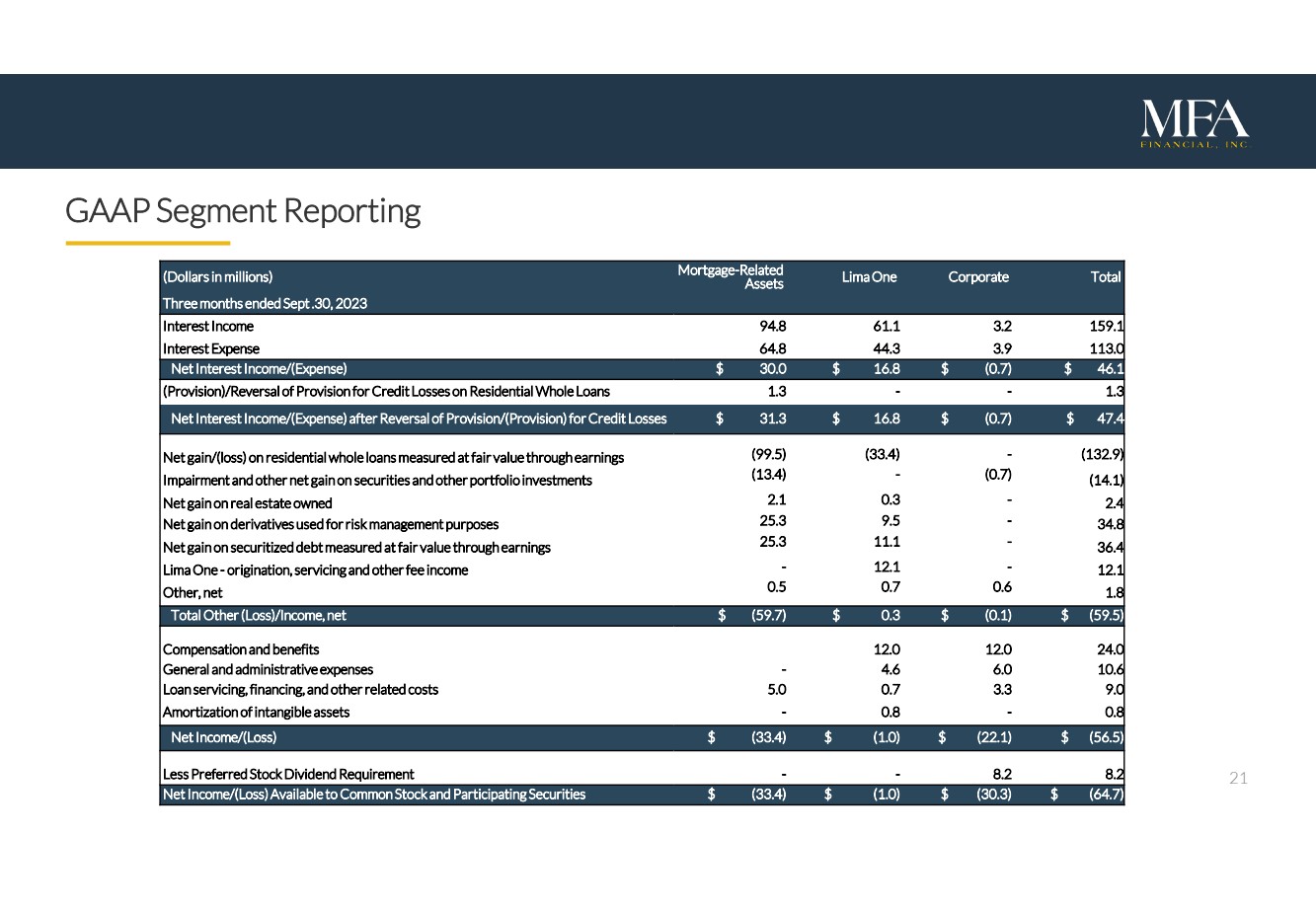 21 GAAP Segment Reporting (Dollars in m illions) Mortgage - Related Assets Lima One Corporate Total Three months ended Sept .30, 2023 Interest Income 94.8 61.1 3.2 159.1 Interest Expense 64.8 44.3 3.9 113.0 Net Interest Income /(Expense) $ 30.0 $ 16.8 $ (0.7) $ 46.1 (Provision)/Reversal of Provision for Credit Losses on Residential Whole Loans 1.3 - - 1.3 Net Interest Income /(Expense) after Reversal of Provision/( Provision ) for Credit Losses $ 31.3 $ 16.8 $ (0.7) $ 47.4 Net gain/(loss) on residential whole loans measured at fair value through earnings (99.5) (33.4) - (132.9) Impairment and other net gain on securities and other portfolio investments (13.4) - (0.7) (14.1) Net gain on real estate owned 2.1 0.3 - 2.4 Net gain on derivatives used for risk management purposes 25.3 9.5 - 34.8 Net gain on securitized debt measured at fair value through earnings 25.3 11.1 - 36.4 Lima One - origination, servicing and other fee income - 12.1 - 12.1 Other, net 0.5 0.7 0.6 1.8 Total Other ( Loss )/Income , net $ (59.7) $ 0.3 $ (0.1) $ (59.5) Compensation and benefits 12.0 12.0 24.0 General and administrative expenses - 4.6 6.0 10.6 Loan servicing, financing, and other related costs 5.0 0.7 3.3 9.0 Amortization of intangible assets - 0.8 - 0.8 Net Income/( Loss ) $ (33.4) $ (1.0) $ (22.1) $ (56.5) Less Preferred Stock Dividend Requirement - - 8.2 8.2 Net Income/( Loss ) Available to Common Stock and Participating Securities $ (33.4) $ (1.0) $ (30.3) $ (64.7)