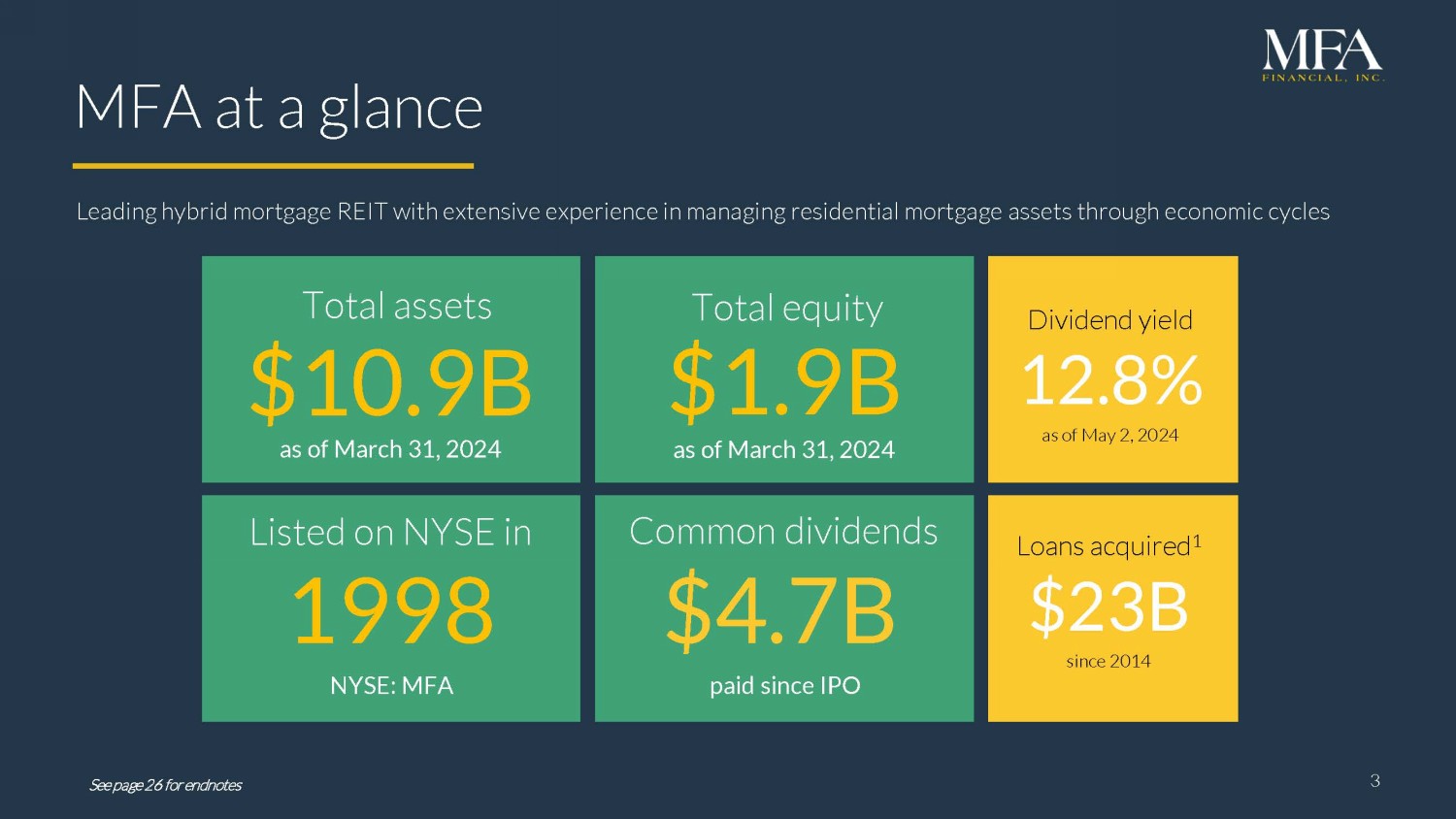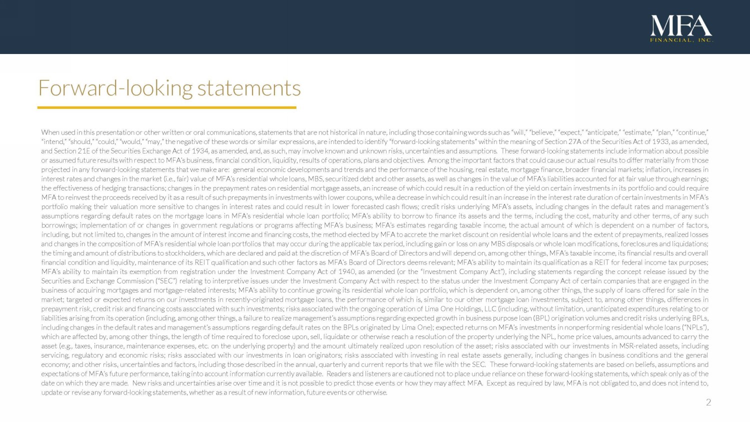 2 Q3 202 2 Financial Snapshot Forward - looking statements When used in this presentation or other written or oral communications, statements that are not historical in nature, including those containing words such as “will,” “believe,” “expect,” “anticipate,” “estimate,” “plan,” “continue,” “intend,” “should,” “could,” “would,” “may,” the negative of these words or similar expressions, are intended to identify “forward - looking statements” within the meaning of Section 27 A of the Securities Act of 1933 , as amended, and Section 21 E of the Securities Exchange Act of 1934 , as amended, and, as such, may involve known and unknown risks, uncertainties and assumptions . These forward - looking statements include information about possible or assumed future results with respect to MFA’s business, financial condition, liquidity, results of operations, plans and objectives . Among the important factors that could cause our actual results to differ materially from those projected in any forward - looking statements that we make are : general economic developments and trends and the performance of the housing, real estate, mortgage finance, broader financial markets ; inflation, increases in interest rates and changes in the market (i . e . , fair) value of MFA’s residential whole loans, MBS, securitized debt and other assets, as well as changes in the value of MFA’s liabilities accounted for at fair value through earnings ; the effectiveness of hedging transactions ; changes in the prepayment rates on residential mortgage assets, an increase of which could result in a reduction of the yield on certain investments in its portfolio and could require MFA to reinvest the proceeds received by it as a result of such prepayments in investments with lower coupons, while a decrease in which could result in an increase in the interest rate duration of certain investments in MFA’s portfolio making their valuation more sensitive to changes in interest rates and could result in lower forecasted cash flows ; credit risks underlying MFA’s assets, including changes in the default rates and management’s assumptions regarding default rates on the mortgage loans in MFA’s residential whole loan portfolio ; MFA’s ability to borrow to finance its assets and the terms, including the cost, maturity and other terms, of any such borrowings ; implementation of or changes in government regulations or programs affecting MFA’s business ; MFA’s estimates regarding taxable income, the actual amount of which is dependent on a number of factors, including, but not limited to, changes in the amount of interest income and financing costs, the method elected by MFA to accrete the market discount on residential whole loans and the extent of prepayments, realized losses and changes in the composition of MFA’s residential whole loan portfolios that may occur during the applicable tax period, including gain or loss on any MBS disposals or whole loan modifications, foreclosures and liquidations ; the timing and amount of distributions to stockholders, which are declared and paid at the discretion of MFA’s Board of Directors and will depend on, among other things, MFA’s taxable income, its financial results and overall financial condition and liquidity, maintenance of its REIT qualification and such other factors as MFA’s Board of Directors deems relevant ; MFA’s ability to maintain its qualification as a REIT for federal income tax purposes ; MFA’s ability to maintain its exemption from registration under the Investment Company Act of 1940 , as amended (or the “Investment Company Act”), including statements regarding the concept release issued by the Securities and Exchange Commission (“SEC”) relating to interpretive issues under the Investment Company Act with respect to the status under the Investment Company Act of certain companies that are engaged in the business of acquiring mortgages and mortgage - related interests ; MFA’s ability to continue growing its residential whole loan portfolio, which is dependent on, among other things, the supply of loans offered for sale in the market ; targeted or expected returns on our investments in recently - originated mortgage loans, the performance of which is, similar to our other mortgage loan investments, subject to, among other things, differences in prepayment risk, credit risk and financing costs associated with such investments ; risks associated with the ongoing operation of Lima One Holdings, LLC (including, without limitation, unanticipated expenditures relating to or liabilities arising from its operation (including, among other things, a failure to realize management’s assumptions regarding expected growth in business purpose loan (BPL) origination volumes and credit risks underlying BPLs, including changes in the default rates and management’s assumptions regarding default rates on the BPLs originated by Lima One) ; expected returns on MFA’s investments in nonperforming residential whole loans (“NPLs”), which are affected by, among other things, the length of time required to foreclose upon, sell, liquidate or otherwise reach a resolution of the property underlying the NPL, home price values, amounts advanced to carry the asset (e . g . , taxes, insurance, maintenance expenses, etc . on the underlying property) and the amount ultimately realized upon resolution of the asset ; risks associated with our investments in MSR - related assets, including servicing, regulatory and economic risks ; risks associated with our investments in loan originators ; risks associated with investing in real estate assets generally, including changes in business conditions and the general economy ; and other risks, uncertainties and factors, including those described in the annual, quarterly and current reports that we file with the SEC . These forward - looking statements are based on beliefs, 