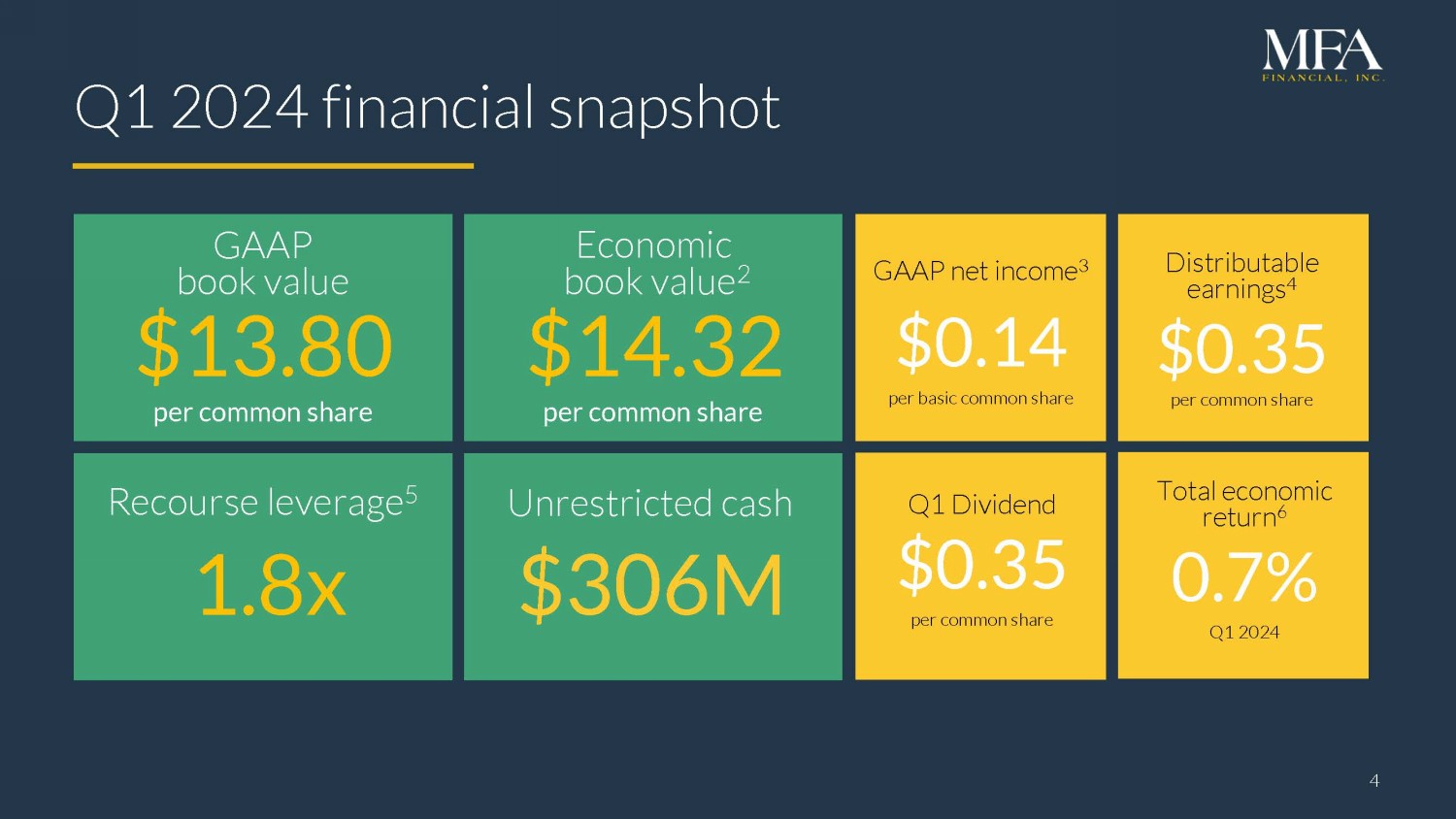 3 v MFA at a glance 3 $1.9B Total equity 1998 Listed on NYSE in Leading hybrid mortgage REIT with extensive experience in managing residential mortgage assets through economic cycles $10.9B Total assets NYSE: MFA $4.7B Common dividends as of March 31, 2024 as of March 31, 2024 paid since IPO See page 26 for endnotes Dividend yield 12.8% as of May 2, 2024 Loans acquired 1 $23B since 2014