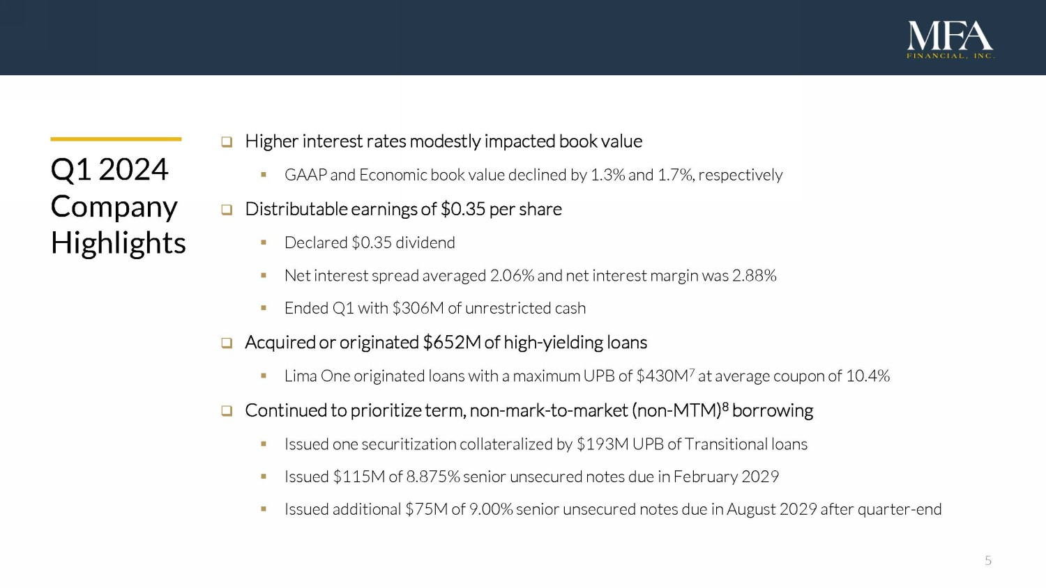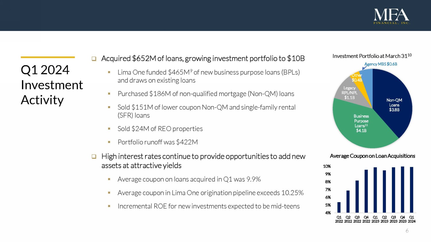5 Q1 2024 Company Highlights □ Higher interest rates modestly impacted book value ▪ GAAP and Economic book value declined by 1.3% and 1.7%, respectively □ Distributable earnings of $0.35 per share ▪ Declared $0.35 dividend ▪ Net interest spread averaged 2.06% and net interest margin was 2.88% ▪ Ended Q1 with $306M of unrestricted cash □ Acquired or originated $652M of high - yielding loans ▪ Lima One originated loans with a maximum UPB of $430M 7 at average coupon of 10.4% □ Continued to prioritize term, non - mark - to - market (non - MTM) 8 borrowing ▪ Issued one securitization collateralized by $193M UPB of Transitional loans ▪ Issued $115M of 8.875% senior unsecured notes due in February 2029 ▪ Issued additional $75M of 9.00% senior unsecured notes due in August 2029 after quarter - end