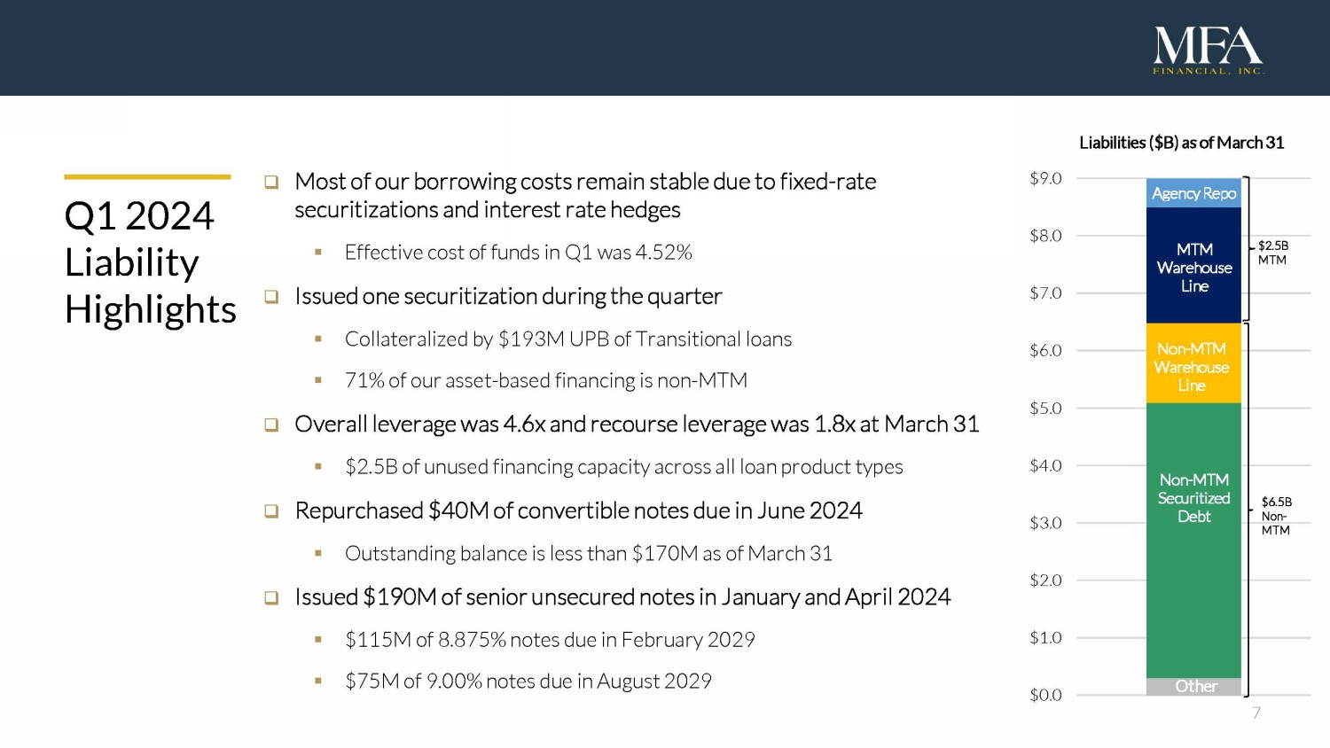 6 □ Acquired $652M of loans, growing investment portfolio to $10B ▪ Lima One funded $465M 9 of new business purpose loans (BPLs) and draws on existing loans ▪ Purchased $186M of non - qualified mortgage (Non - QM) loans ▪ Sold $151M of lower coupon Non - QM and single - family rental (SFR) loans ▪ Sold $24M of REO properties ▪ Portfolio runoff was $422M □ High interest rates continue to provide opportunities to add new assets at attractive yields ▪ Average coupon on loans acquired in Q1 was 9.9% ▪ Average coupon in Lima One origination pipeline exceeds 10.25% ▪ Incremental ROE for new investments expected to be mid - teens Q1 2024 Investment Activity Investment Portfolio at March 31 10 Agency MBS $0.6B Average Coupon on Loan Acquisitions Non - QM Loans $3.8B Business Purpose Loans 11 $4.1B Legacy RPL/NPL $1.1B Other $0.4B 4% 5% 6% 7% 8% 9% 10% Q1 2022 Q2 2022 Q3 2022 Q4 2022 Q1 2023 Q2 2023 Q3 2023 Q4 2023 Q1 2024