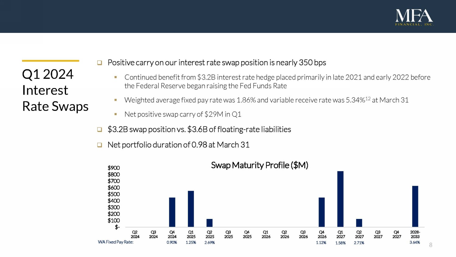 7 Q1 2024 Liability Highlights □ Most of our borrowing costs remain stable due to fixed - rate securitizations and interest rate hedges ▪ Effective cost of funds in Q1 was 4.52% □ Issued one securitization during the quarter ▪ Collateralized by $193M UPB of Transitional loans ▪ 71% of our asset - based financing is non - MTM □ Overall leverage was 4.6x and recourse leverage was 1.8x at March 31 ▪ $2.5B of unused financing capacity across all loan product types □ Repurchased $40M of convertible notes due in June 2024 ▪ Outstanding balance is less than $170M as of March 31 □ Issued $190M of senior unsecured notes in January and April 2024 ▪ $115M of 8.875% notes due in February 2029 ▪ $75M of 9.00% notes due in August 2029 MTM Warehouse Line Non - MTM Warehouse Line Non - MTM Securitized Debt Other MTM Warehouse Lines Non - MTM Warehouse Lines Other $2.5B MTM $6.5B Non - MTM $0.0 $1.0 $2.0 $3.0 $4.0 $5.0 $6.0 $7.0 $8.0 $9.0 Liabilities ($B) as of March 31 Agency MTM Warehouse Line Non - MTM Warehouse Line Non - MTM Securitized Debt Other