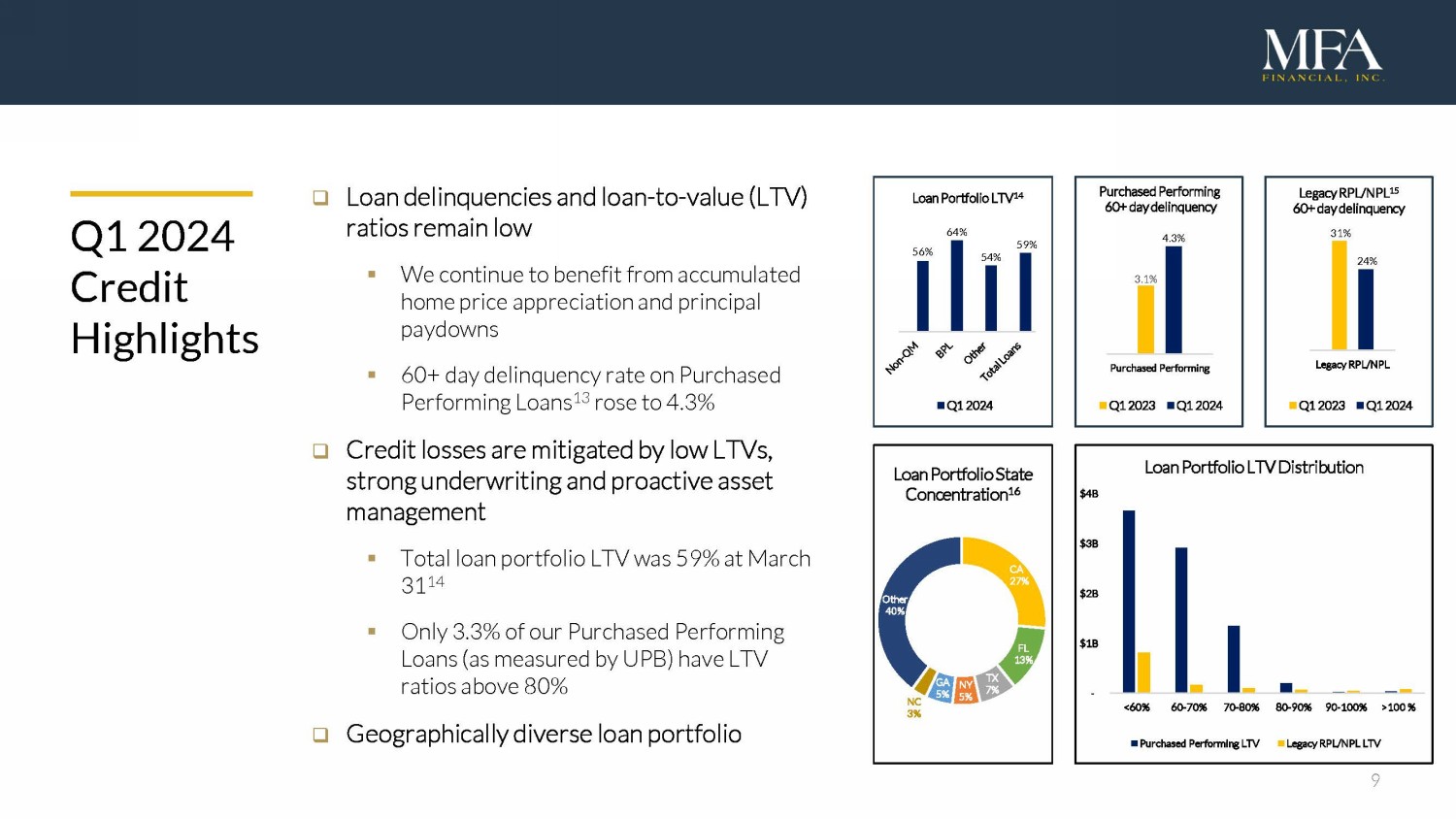 8 Q1 2024 Interest Rate Swaps □ Positive carry on our interest rate swap position is nearly 350 bps ▪ Continued benefit from $3.2B interest rate hedge placed primarily in late 2021 and early 2022 before the Federal Reserve began raising the Fed Funds Rate ▪ Weighted average fixed pay rate was 1.86% and variable receive rate was 5.34% 12 at March 31 ▪ Net positive swap carry of $29M in Q1 □ $3.2B swap position vs. $3.6B of floating - rate liabilities □ Net portfolio duration of 0.98 at March 31 0.90% 1.25% WA Fixed Pay Rate: 2.69% 1.12% 1.58% 2.71% 3.64% $- $100 $200 $300 $400 $500 $600 $700 $800 $900 Q2 2024 Q3 2024 Q4 2024 Q1 2025 Q2 2025 Q3 2025 Q4 2025 Q1 2026 Q2 2026 Q3 2026 Q4 2026 Q1 2027 Q2 2027 Q3 2027 Q4 2027 2028- 2033 Swap Maturity Profile ($M)