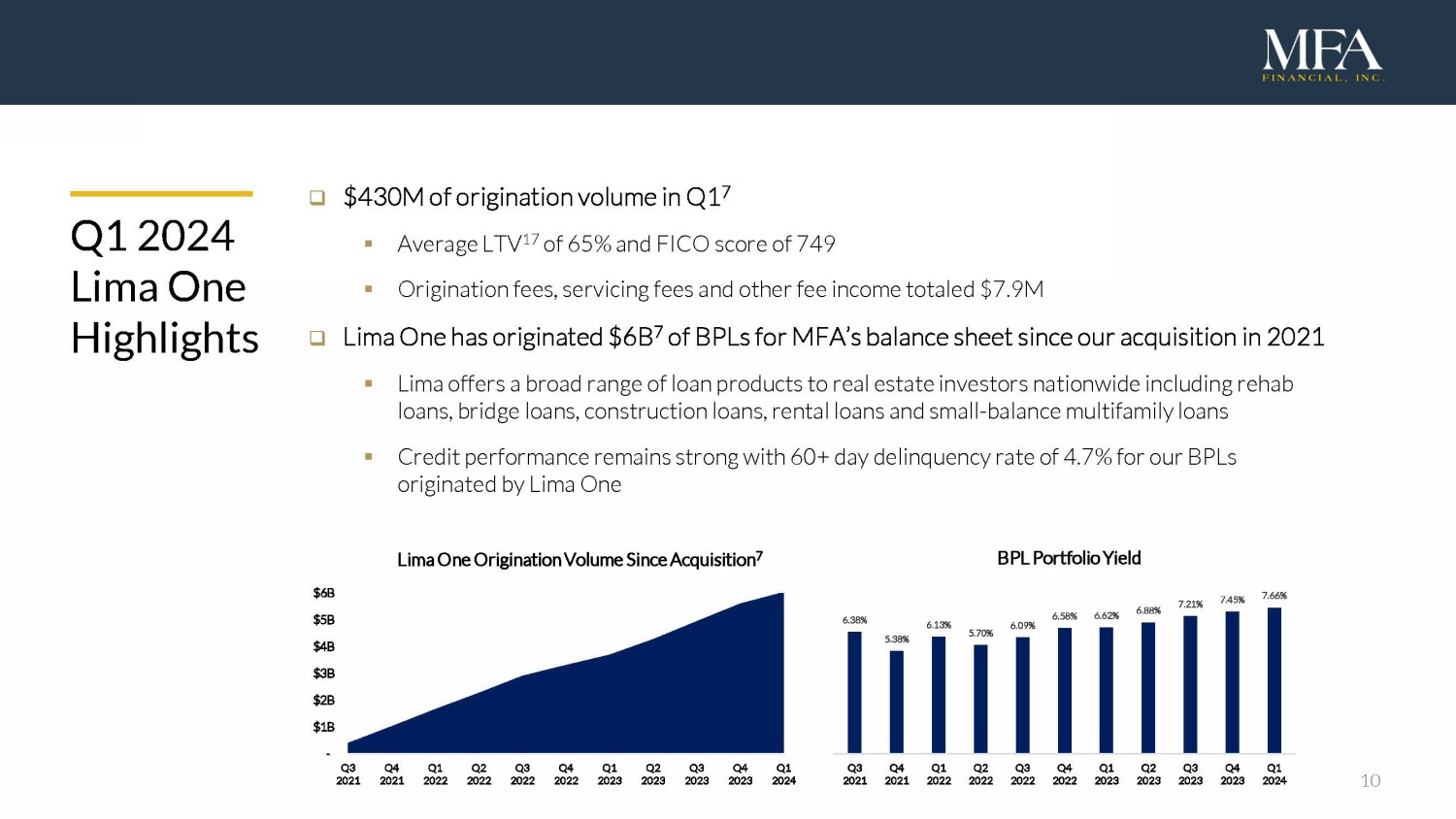 9 □ Loan delinquencies and loan - to - value (LTV) ratios remain low ▪ We continue to benefit from accumulated home price appreciation and principal paydowns ▪ 60+ day delinquency rate on Purchased Performing Loans 13 rose to 4.3% □ Credit losses are mitigated by low LTVs, strong underwriting and proactive asset management ▪ Total loan portfolio LTV was 59% at March 31 14 ▪ Only 3.3% of our Purchased Performing Loans (as measured by UPB) have LTV ratios above 80% □ Geographically diverse loan portfolio Q1 2024 Credit Highlights 31% 24% Legacy RPL/NPL Legacy RPL/NPL 15 60+ day delinquency Q1 2023 Q1 2024 3.1% 4.3% Purchased Performing Purchased Performing 60+ day delinquency Q1 2023 Q1 2024 56% 64% 54% 59% Loan Portfolio LTV 14 Q1 2024 CA 27% FL 13% TX 7% NY 5% GA 5% NC 3% Other 40% Loan Portfolio State Concentration 16 - $1B $2B $3B $4B <60% 60-70% 70-80% 80-90% 90-100% >100 % Loan Portfolio LTV Distribution Purchased Performing LTV Legacy RPL/NPL LTV