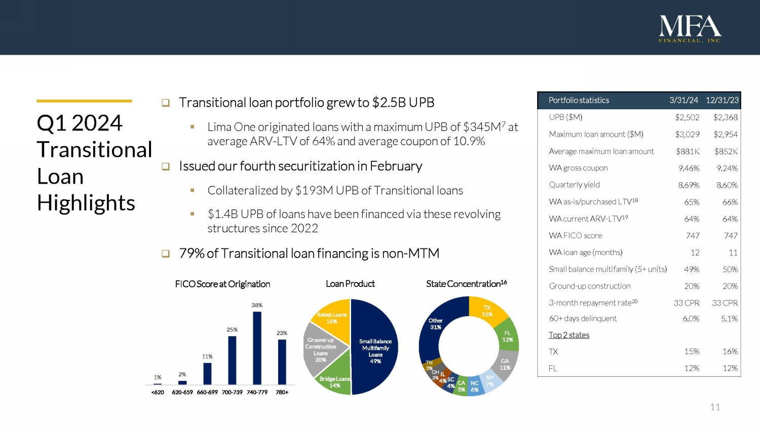 10 □ $430M of origination volume in Q1 7 ▪ Average LTV 17 of 65% and FICO score of 749 ▪ Origination fees, servicing fees and other fee income totaled $7.9M □ Lima One has originated $6B 7 of BPLs for MFA’s balance sheet since our acquisition in 2021 ▪ Lima offers a broad range of loan products to real estate investors nationwide including rehab loans, bridge loans, construction loans, rental loans and small - balance multifamily loans ▪ Credit performance remains strong with 60+ day delinquency rate of 4.7% for our BPLs originated by Lima One Q1 2024 Lima One Highlights - $1B $2B $3B $4B $5B $6B Q3 2021 Q4 2021 Q1 2022 Q2 2022 Q3 2022 Q4 2022 Q1 2023 Q2 2023 Q3 2023 Q4 2023 Q1 2024 Lima One Origination Volume Since Acquisition 7 6.38% 5.38% 6.13% 5.70% 6.09% 6.58% 6.62% 6.88% 7.21% 7.45% 7.66% Q3 2021 Q4 2021 Q1 2022 Q2 2022 Q3 2022 Q4 2022 Q1 2023 Q2 2023 Q3 2023 Q4 2023 Q1 2024 BPL Portfolio Yield