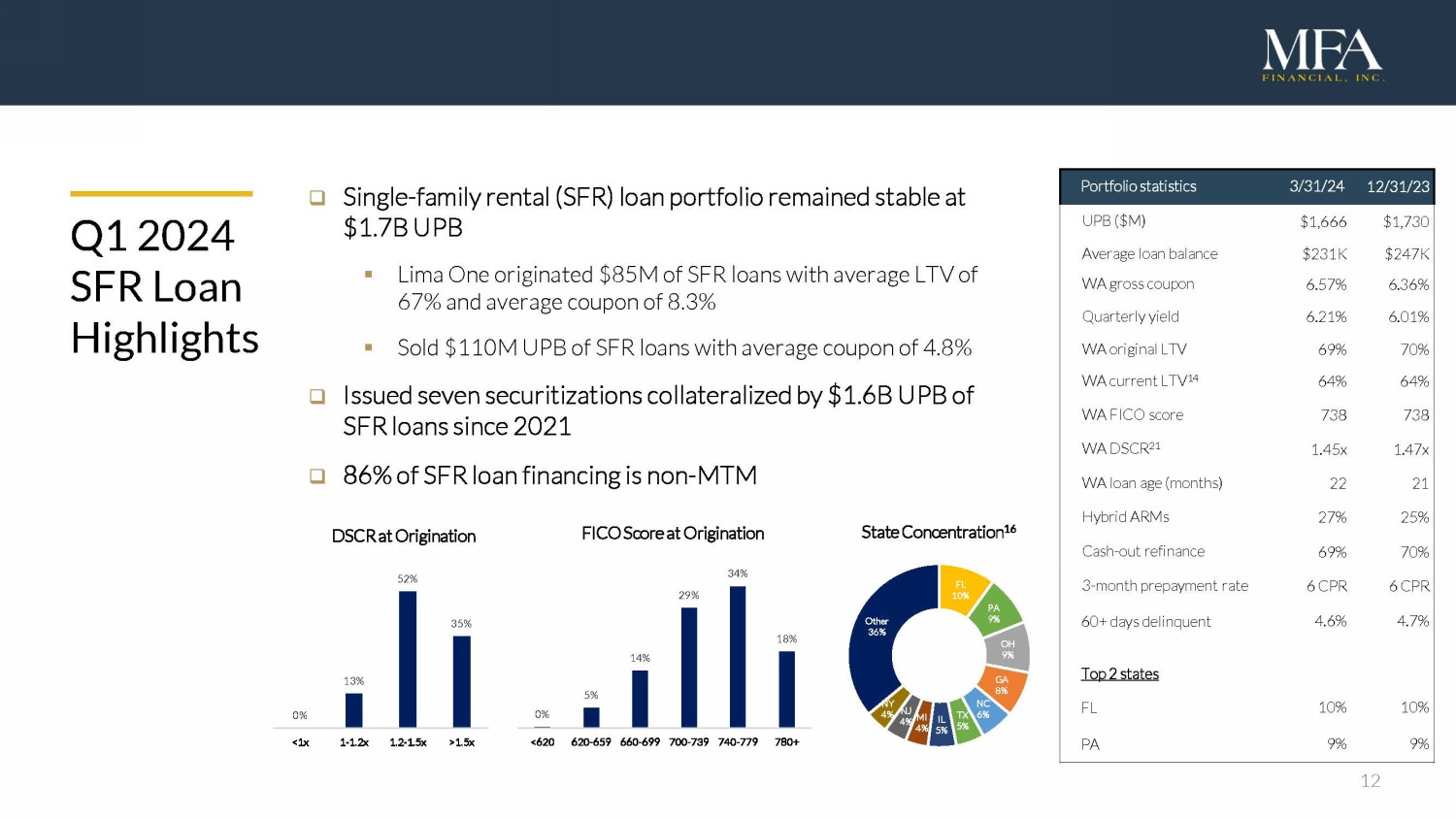 11 Portfolio s tatistics 3/31/24 12/31/2 3 UPB ($M) $2,502 $2,368 1 Maximum loan amount ($M) $3,029 $2,954 1 Average maximum loan amount $881K $852K 1 WA gross coupon 9.46% 9.24% 1 Quarterly yield 8.69% 8.60% 1 WA as - is/purchased LTV 18 65% 66% 1 WA current ARV - LTV 19 64% 64% 1 WA FICO score 747 747 1 WA loan age (months) 12 11 1 Small balance multifamily (5+ units) 49% 50% 1 Ground - up construction 20% 20% 1 3 - month repayment rate 20 33 CPR 33 CPR 1 60+ days delinquent 6.0% 5.1% 1 Top 2 states TX 15% 16% 1 FL 12% 12% 1 Q1 2024 Transitional Loan Highlights □ Transitional loan portfolio grew to $2.5B UPB ▪ Lima One originated loans with a maximum UPB of $345M 7 at average ARV - LTV of 64% and average coupon of 10.9% □ Issued our fourth securitization in February ▪ Collateralized by $193M UPB of Transitional loans ▪ $1.4B UPB of loans have been financed via these revolving structures since 2022 □ 79% of Transitional loan financing is non - MTM TX 15% FL 12% GA 11% NY 7% NC 6% CA 5% SC 4% IL 4% OH 3% TN 3% Other 31% State Concentration 16 Small Balance Multifamily Loans 49% Bridge Loans 14% Ground - up Construction Loans 20% Rehab Loans 16% Loan Product 1% 2% 11% 25% 38% 23% <620 620-659 660-699 700-739 740-779 780+ FICO Score at Origination