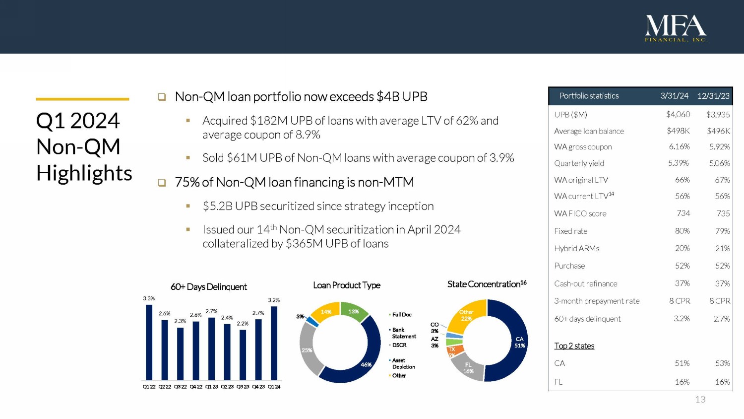 13 Q1 2024 Non - QM Highlights □ Non - QM loan portfolio now exceeds $4B UPB ▪ Acquired $182M UPB of loans with average LTV of 62% and average coupon of 8.9% ▪ Sold $61M UPB of Non - QM loans with average coupon of 3.9% □ 75% of Non - QM loan financing is non - MTM ▪ $5.2B UPB securitized since strategy inception ▪ Issued our 14 th Non - QM securitization in April 2024 collateralized by $365M UPB of loans P ortfolio s tatistics 3/31/24 12/31/23 UPB ($M) $4,060 $3,935 1 Average loan balance $498K $496K 1 WA gross coupon 6.16% 5.92% 1 Quarterly yield 5.39% 5.06% 1 WA original LTV 66% 67% 1 WA current LTV 14 56% 56% 1 WA FICO score 734 735 1 Fixed rate 80% 79% 1 Hybrid ARMs 20% 21% 1 Purchase 52% 52% 1 Cash - out refinance 37% 37% 1 3 - month prepayment rate 8 CPR 8 CPR 1 60+ days delinquent 3.2% 2.7% 1 Top 2 states CA 51% 53% 1 FL 16% 16% 1 3.3% 2.6% 2.3% 2.6% 2.7% 2.4% 2.2% 2.7% 3.2% Q1 22 Q2 22 Q3 22 Q4 22 Q1 23 Q2 23 Q3 23 Q4 23 Q1 24 60+ Days Delinquent CA 51% FL 16% TX 5% AZ 3% CO 3% Other 22% State Concentration 16 13% 46% 25% 3% 14% Loan Product Type Full Doc Bank Statement DSCR Asset Depletion Other