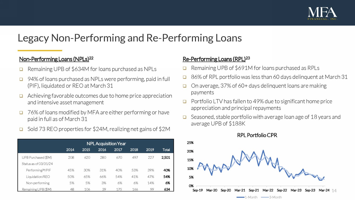 14 Legacy Non - Performing and Re - Performing Loans Non - Performing L oans (NPLs) 22 □ Remaining UPB of $634M for loans purchased as NPLs □ 94% of loans purchased as NPLs were performing, paid in full (PIF), liquidated or REO at March 31 □ Achieving favorable outcomes due to home price appreciation and intensive asset management □ 76% of loans modified by MFA are either performing or have paid in full as of March 31 □ Sold 73 REO properties for $24M, realizing net gains of $2M Re - Performing Loans (RPL) 23 □ Remaining UPB of $ 691M for loans purchased as RPLs □ 8 6 % of RPL portfolio was less than 60 days delinquent a t March 31 □ On average, 37 % of 60+ days delinquent loans are making payments □ Portfolio LTV has fallen to 49 % due to significant home price appreciation and principal repayments □ Seasoned , stable portfolio with average loan age of 1 8 years and average UPB of $188K NPL Acquisition Year 2014 2015 2016 2017 2018 2019 Total UPB Purchased ($M) 208 620 280 670 497 227 2,501 Status as of 03/31/24 Performing 24 /PIF 45% 30% 31% 40% 53% 39% 40% Liquidation/REO 50% 65% 66% 54% 41% 47% 54% Non - performing 5% 5% 3% 6% 6% 14% 6% Remaining UPB ($M) 48 106 39 175 166 99 634 0% 5% 10% 15% 20% 25% Sep-19 Mar-20 Sep-20 Mar-21 Sep-21 Mar-22 Sep-22 Mar-23 Sep-23 Mar-24 RPL Portfolio CPR 1-Month 3-Month