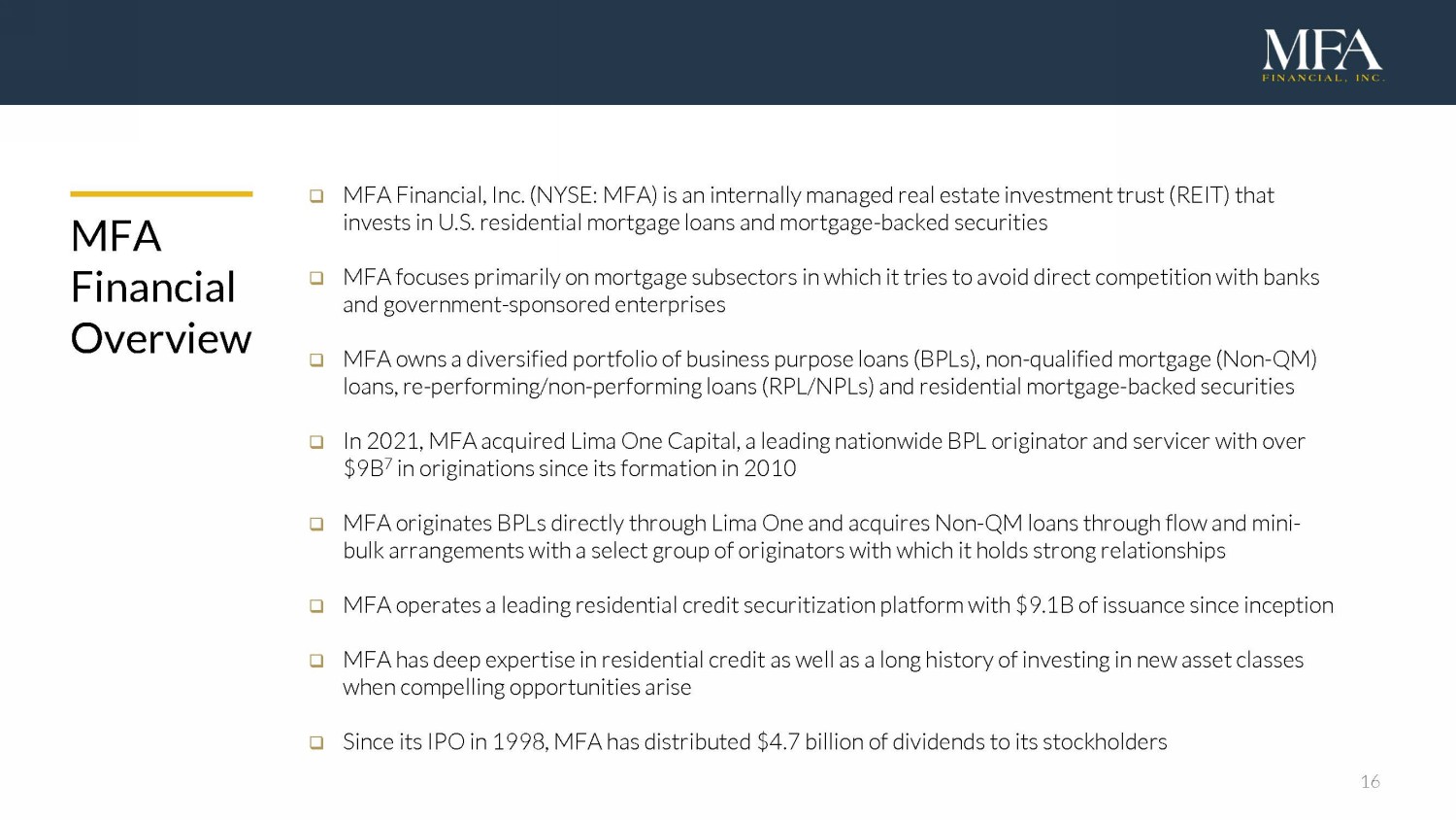 16 MFA Financial Overview □ MFA Financial, Inc. (NYSE: MFA) is an internally managed real estate investment trust (REIT) that invests in U.S. residential mortgage loans and mortgage - backed securities □ MFA focuses primarily on mortgage subsectors in which it tries to avoid direct competition with banks and government - sponsored enterprises □ MFA owns a diversified portfolio of business purpose loans (BPLs), non - qualified mortgage (Non - QM) loans, re - performing/non - performing loans (RPL/NPLs) and residential mortgage - backed securities □ In 2021, MFA acquired Lima One Capital, a leading nationwide BPL originator and servicer with over $9B 7 in originations since its formation in 2010 □ MFA originates BPLs directly through Lima One and acquires Non - QM loans through flow and mini - bulk arrangements with a select group of originators with which it holds strong relationships □ MFA operates a leading residential credit securitization platform with $9.1B of issuance since inception □ MFA has deep expertise in residential credit as well as a long history of investing in new asset classes when compelling opportunities arise □ Since its IPO in 1998, MFA has distributed $4.7 billion of dividends to its stockholders