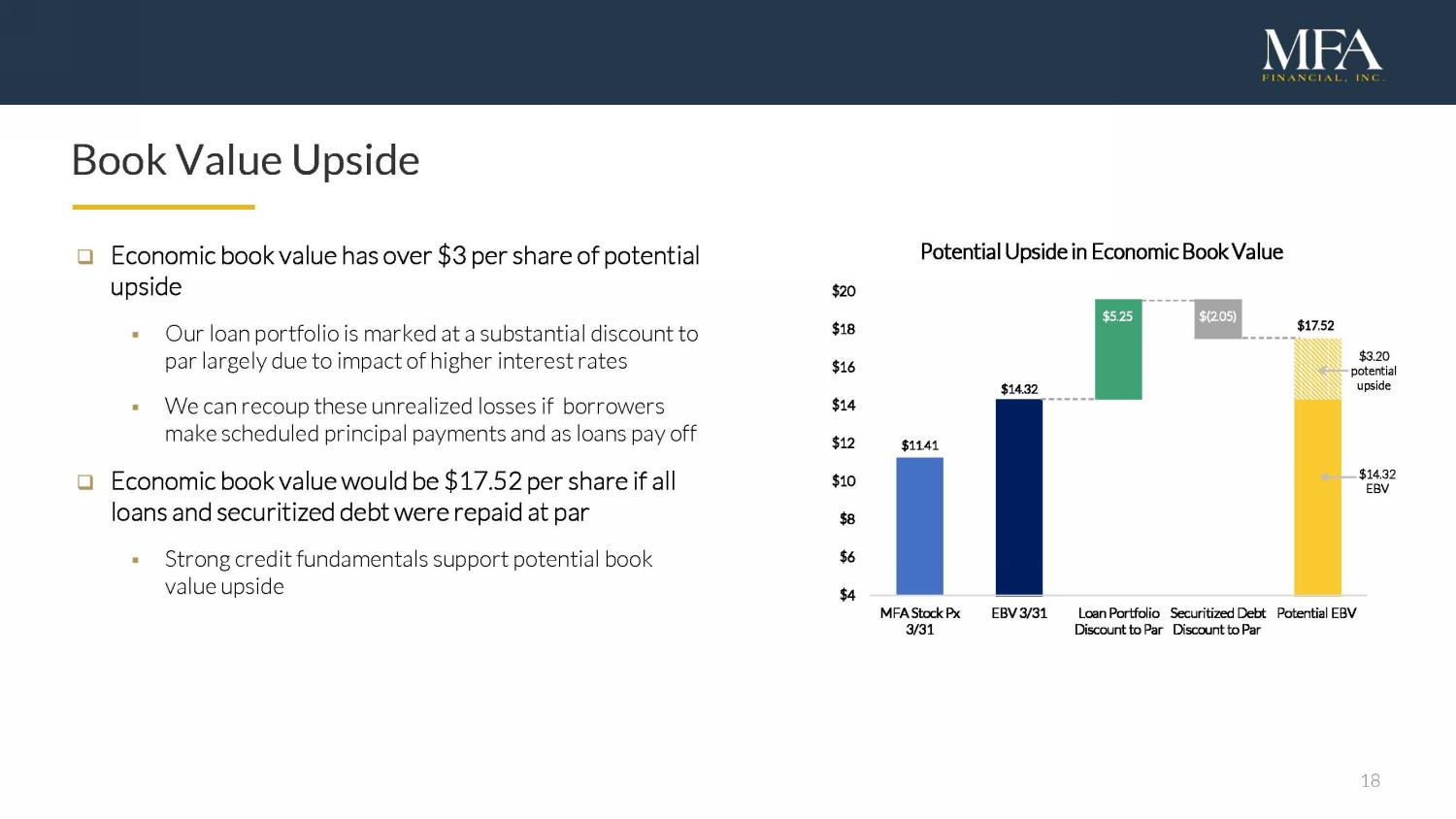 17 Lima One: Leading Nationwide BPL Originator and Servicer Product Offerings □ Lima One offers a diverse selection of both short - term and long - term financing solutions to experienced real estate investors across the U.S. □ Current products include rehab loans, construction loans, single - family rental loans and small - balance multifamily loans Fully Integrated BPL Platform □ Lima One, a wholly - owned subsidiary of MFA, is an industry - leading, fully integrated business purpose lending platform □ Lima operates an efficient and scalable platform with over 300 employees headquartered in Greenville, SC □ Lima has originated $6 B 7 since MFA’s acquisition in 2021 and $9B 7 since its formation in 2010 □ Origination volume of $2.3B 7 in both 2022 and 2023 □ Lima provides MFA with access to organically - created, high - yielding loans, substantially below the cost to purchase from third parties Credit Quality □ Strong focus on credit quality, with disciplined underwriting, in - house servicing and construction management teams □ Conservative underwriting with average FICO score of 744 and average LTV of 66% 14 as of March 31, 2024 □ 60+ day delinquency rate of 4.7% as of March 31, 2024 25 □ Historical losses of less than 1 bp on over $2B of payoffs and liquidations for loans held by MFA and originated by Lima One Geographic and Borrower Diversity □ No state concentration above 15% and no borrower concentration above 2% Concentration 10% to 15% 5% to 10% Below 5% No loans TX FL TX FL