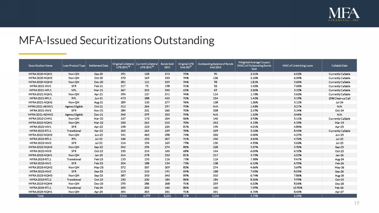 19 MFA - Issued Securitizations Outstanding Securitization Name Loan Product Type Settlement Date Original Collateral UPB ($M) 26 Current Collateral UPB ($M) 26 Bonds Sold ($M) Original UPB Sold (%) 27 Outstanding Balance of Bonds Sold ($M) Weighted Average Coupon (WAC) of Outstanding Bonds Sold WAC of Underlying Loans Callable Date MFRA 2020 - NQM1 Non - QM Sep - 20 391 108 373 95% 90 2.31% 6.02% Currently Callable MFRA 2020 - NQM2 Non - QM Oct - 20 570 169 535 94% 136 2.16% 6.34% Currently Callable MFRA 2020 - NQM3 Non - QM Dec - 20 381 121 359 94% 98 1.81% 5.60% Currently Callable MFRA 2021 - INV1 SFR Feb - 21 217 75 198 91% 56 1.42% 7.06% Currently Callable MFRA 2021 - NPL1 NPL Mar - 21 367 205 240 65% 69 2.36% 5.22% Currently Callable MFRA 2021 - NQM1 Non - QM Apr - 21 394 137 371 94% 114 1.73% 5.62% Currently Callable MFRA 2021 - RPL1 RPL Jun - 21 473 288 435 92% 254 1.42% 5.19% 20% Clean - up Call MFRA 2021 - NQM2 Non - QM Aug - 21 289 150 277 96% 138 1.36% 5.11% Jul - 24 MFRA 2021 - AEINV1 Agency Eligible Oct - 21 312 266 297 95% N/A 1.43% 3.27% N/A MFRA 2021 - INV2 SFR Nov - 21 284 231 260 92% 208 2.19% 5.14% Oct - 24 MFRA 2021 - AEINV2 Agency Eligible Dec - 21 340 299 323 95% N/A 1.52% 3.46% N/A MFRA 2022 - CHM1 Non - QM Mar - 22 237 173 204 86% 140 3.93% 5.11% Currently Callable MFRA 2022 - NQM1 Non - QM Mar - 22 333 265 310 93% 242 4.15% 4.55% Mar - 25 MFRA 2022 - INV1 SFR Apr - 22 258 223 224 87% 190 4.01% 4.84% Apr - 25 MFRA 2022 - RTL1 Transitional Apr - 22 265 265 239 90% 239 5.22% 8.45% Currently Callable MFRA 2022 - NQM2 Non - QM Jun - 22 541 465 398 74% 333 4.00% 4.27% Jun - 25 MFRA 2022 - RPL1 RPL Jul - 22 336 253 307 91% 240 3.40% 4.92% Jul - 25 MFRA 2022 - INV2 SFR Jul - 22 214 194 169 79% 150 4.95% 5.63% Jul - 25 MFRA 2022 - NQM3 Non - QM Sep - 22 342 296 274 80% 228 5.57% 5.90% Sep - 25 MFRA 2022 - INV3 SFR Oct - 22 235 214 160 68% 144 6.00% 6.52% Oct - 25 MFRA 2023 - NQM1 Non - QM Jan - 23 314 278 253 81% 217 5.75% 6.02% Jan - 26 MFRA 2023 - RTL1 Transitional Feb - 23 155 155 116 75% 116 7.58% 9.47% Aug - 24 MFRA 2023 - INV1 SFR Feb - 23 204 188 154 75% 138 6.10% 6.95% Feb - 26 MFRA 2023 - NQM2 Non - QM May - 23 372 337 309 83% 274 4.66% 5.69% May - 26 MFRA 2023 - INV2 SFR Sep - 23 215 210 191 89% 188 7.05% 8.05% Sep - 26 MFRA 2023 - NQM3 Non - QM Sep - 23 387 353 343 89% 310 6.74% 7.86% Aug - 26 MFRA 2023 - RTL2 Transitional Oct - 23 230 230 184 80% 184 8.50% 9.99% Oct - 25 MFRA 2023 - NQM4 Non - QM Dec - 23 295 286 268 91% 259 6.32% 8.06% Dec - 26 MFRA 2024 - RTL1 Transitional Feb - 24 200 200 160 80% 160 7.09% 10.90% Feb - 26 MFRA 2024 - NQM1 Non - QM Apr - 24 365 365 331 91% 331 6.70% 8.40% Apr - 27 Total 9,516 6,999 8,262 87% 5,246 4.75% 6.24%