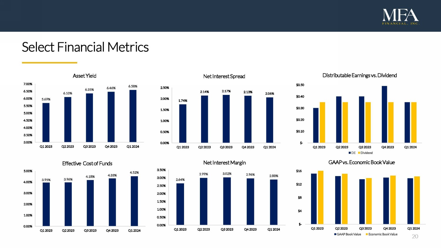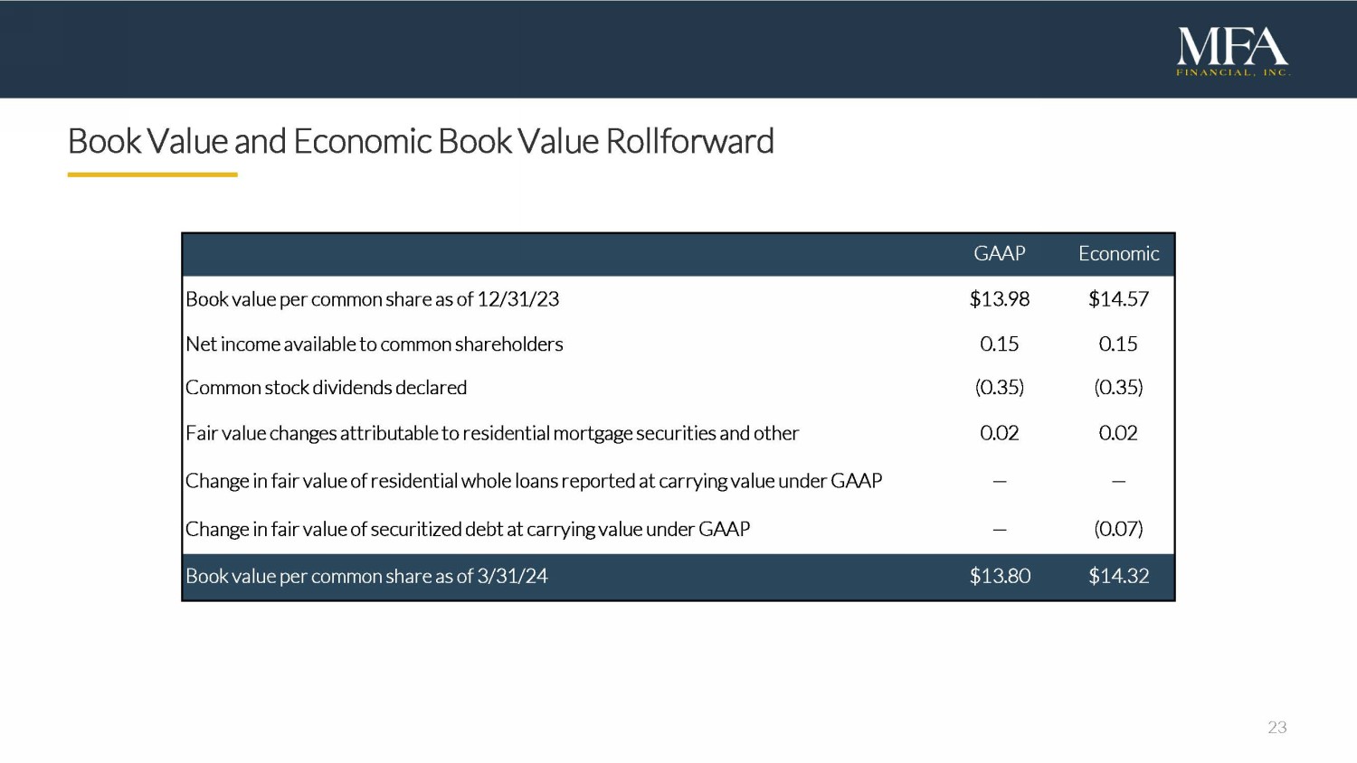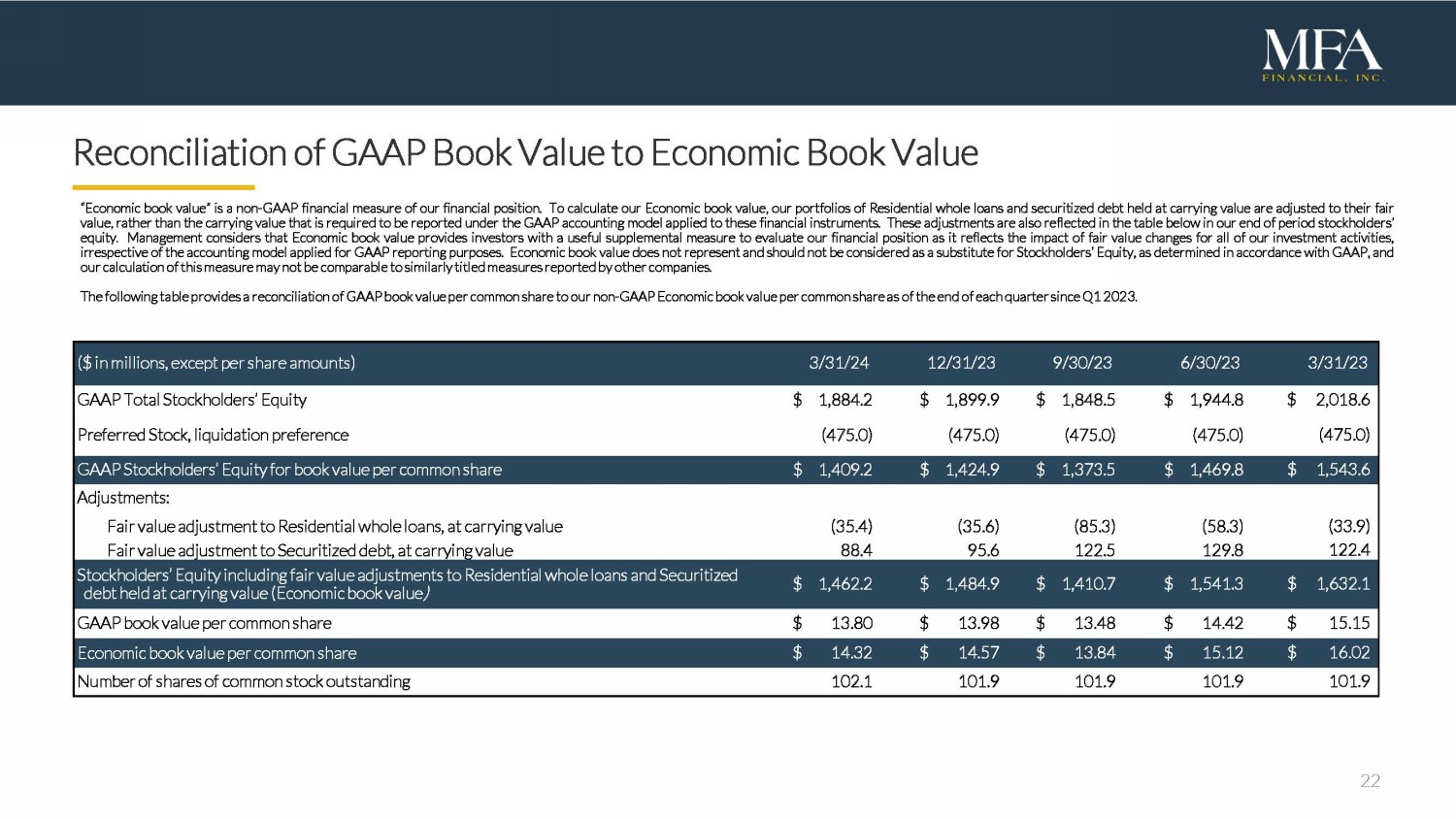 22 Reconciliation of GAAP Book Value to Economic Book Value “Economic book value” is a non - GAAP financial measure of our financial position . To calculate our Economic book value, our portfolios of Residential whole loans and securitized debt held at carrying value are adjusted to their fair value, rather than the carrying value that is required to be reported under the GAAP accounting model applied to these financial instruments . These adjustments are also reflected in the table below in our end of period stockholders’ equity . Management considers that Economic book value provides investors with a useful supplemental measure to evaluate our financial position as it reflects the impact of fair value changes for all of our investment activities, irrespective of the accounting model applied for GAAP reporting purposes . Economic book value does not represent and should not be considered as a substitute for Stockholders’ Equity, as determined in accordance with GAAP, and our calculation of this measure may not be comparable to similarly titled measures reported by other companies . The following table provides a reconciliation of GAAP book value per common share to our non - GAAP Economic book value per common share as of the end of each quarter since Q 1 2023 . ($ i n millions, except per share amounts) 3/31/24 12/31 /2 3 9/30 /2 3 6/30 /2 3 3 /3 1 /2 3 GAAP Total Stockholders’ Equity $ 1,884.2 $ 1,899.9 $ 1,848.5 $ 1,944.8 $ 2,018.6 Preferred Stock, liquidation preference (475.0) (475.0) (475.0) (475.0) (475.0 ) GAAP Stockholders’ Equity for book value per common share $ 1,409.2 $ 1,424.9 $ 1,373.5 $ 1,469.8 $ 1, 543.6 Adjustments: Fair value adjustment to Residential whole loans, at carrying value (35.4) (35.6) (85.3) (58.3) (33.9) Fair value adjustment to Securitized debt, at carrying value 88.4 95.6 122.5 129.8 122.4 Stockholders’ Equity including fair value adjustments to Residential whole loans and Securitized debt held at carrying value (Economic book value ) $ 1,462.2 $ 1,484.9 $ 1,410.7 $ 1,541.3 $ 1,632.1 GAAP book value per common share $ 13.80 $ 13.98 $ 13.48 $ 14.42 $ 15.15 Economic book value per common share $ 14.32 $ 14.57 $ 13.84 $ 15.12 $ 16.02 Number of shares of common stock outstanding 102.1 101.9 101.9 101.9 101. 9