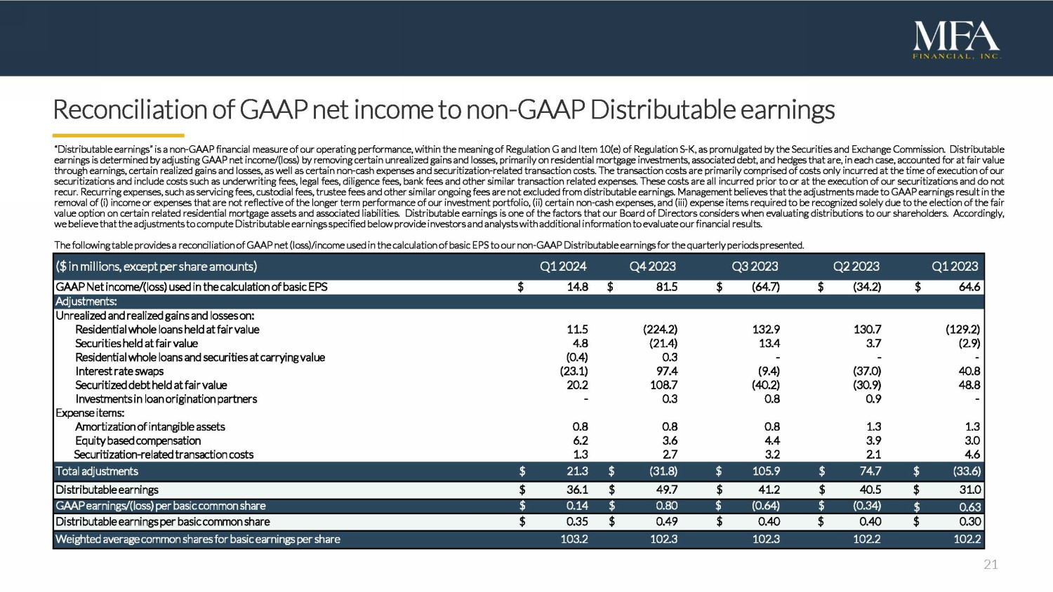 21 Reconciliation of GAAP net income to non - GAAP Distributable earnings “Distributable earnings” is a non - GAAP financial measure of our operating performance, within the meaning of Regulation G and Item 10 (e) of Regulation S - K, as promulgated by the Securities and Exchange Commission . Distributable earnings is determined by adjusting GAAP net income/(loss) by removing certain unrealized gains and losses, primarily on residential mortgage investments, associated debt, and hedges that are, in each case, accounted for at fair value through earnings, certain realized gains and losses, as well as certain non - cash expenses and securitization - related transaction costs . The transaction costs are primarily comprised of costs only incurred at the time of execution of our securitizations and include costs such as underwriting fees, legal fees , diligence fees, bank fees and other similar transaction related expenses . These costs are all incurred prior to or at the execution of our securitizations and do not recur . Recurring expenses, such as servicing fees, custodial fees, trustee fees and other similar ongoing fees are not excluded from distributable earnings . Management believes that the adjustments made to GAAP earnings result in the removal of ( i ) income or expenses that are not reflective of the longer term performance of our investment portfolio, (ii) certain non - cash expenses, and (iii) expense items required to be recognized solely due to the election of the fair value option on certain related residential mortgage assets and associated liabilities . Distributable earnings is one of the factors that our Board of Directors considers when evaluating distributions to our shareholders . Accordingly, we believe that the adjustments to compute Distributable earnings specified below provide investors and analysts with additional information to evaluate our financial results . The following table provides a reconciliation of GAAP net (loss)/income used in the calculation of basic EPS to our non - GAAP Distributable earnings for the quarterly periods presented . ( $ i n m illions, e xcept p er s hare a mounts) Q1 202 4 Q4 202 3 Q3 202 3 Q 2 202 3 Q 1 202 3 1 GAAP Net income/(loss) used in the calculation of basic EPS $ 14.8 $ 81.5 $ (64.7) $ (34.2) $ 64.6 1 Adjustments: Unrealized and realized gains and losses on: Residential whole loans held at fair value 11.5 (224.2) 132.9 130.7 (129.2) 1 Securities held at fair value 4.8 (21.4) 13.4 3.7 (2.9) 1 Residential whole loans and securities at carrying value (0.4) 0.3 - - - 1 Interest rate swaps (23.1) 97.4 (9.4) (37.0) 40.8 1 Securitized debt held at fair value 20.2 108.7 (40.2) (30.9) 48.8 1 Investments in loan origination partners - 0.3 0.8 0.9 - 1 Expense items: Amortization of intangible assets 0.8 0.8 0.8 1.3 1.3 1 Equity based compensation 6.2 3.6 4.4 3.9 3.0 1 Securitization - related transaction costs 1.3 2.7 3.2 2.1 4.6 1 Total adjustments $ 21.3 $ (31.8) $ 105.9 $ 74.7 $ (33.6) 1 Distributable earnings $ 36.1 $ 49.7 $ 41.2 $ 40.5 $ 31.0 1 GAAP earnings/(loss) per basic common share $ 0.14 $ 0.80 $ (0.64) $ (0.34) $ 0.63 1 Distributable earnings per basic common share $ 0.35 $ 0.49 $ 0.40 $ 0.40 $ 0.30 1 Weighted average common shares for basic earnings per share 103.2 102.3 10 2.3 10 2.2 10 2.2 1
