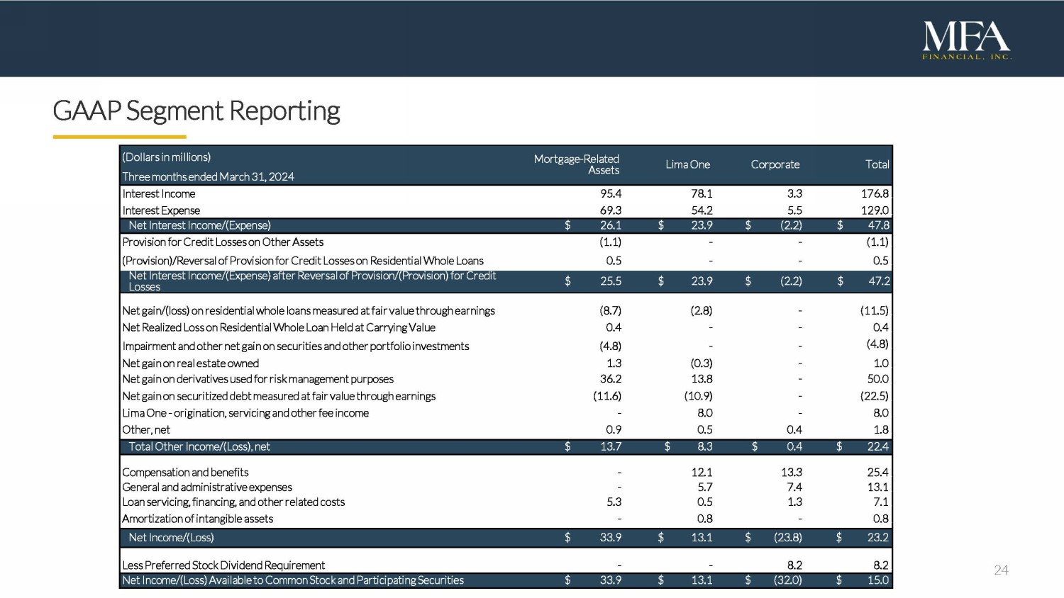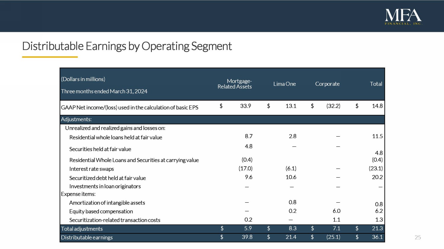 24 GAAP Segment Reporting (Dollars in m illions) Mortgage - Related Assets Lima One Corporate Total Three months ended March 31, 2024 Interest Income 95.4 78.1 3.3 176.8 1 Interest Expense 69.3 54.2 5.5 129.0 1 Net Interest Income /(Expense) $ 26.1 $ 23.9 $ (2.2) $ 47.8 1 Provision for Credit Losses on Other Assets (1.1) - - (1.1) 1 (Provision)/Reversal of Provision for Credit Losses on Residential Whole Loans 0.5 - - 0.5 1 Net Interest Income /(Expense) after Reversal of Provision/( Provision ) for Credit Losses $ 25.5 $ 23.9 $ (2.2) $ 47.2 1 Net gain/(loss) on residential whole loans measured at fair value through earnings (8.7) (2.8) - (11.5) 1 Net Realized Loss on Residential Whole Loan Held at Carrying Value 0.4 - - 0.4 1 Impairment and other net gain on securities and other portfolio investments (4.8) - - (4.8) 1 Net gain on real estate owned 1.3 (0.3) - 1.0 1 Net gain on derivatives used for risk management purposes 36.2 13.8 - 50.0 1 Net gain on securitized debt measured at fair value through earnings (11.6) (10.9) - (22.5) 1 Lima One - origination, servicing and other fee income - 8.0 - 8.0 1 Other, net 0.9 0.5 0.4 1.8 1 Total Other Income/(Loss) , net $ 13.7 $ 8.3 $ 0.4 $ 22.4 1 Compensation and benefits - 12.1 13.3 25.4 1 General and administrative expenses - 5.7 7.4 13.1 1 Loan servicing, financing, and other related costs 5.3 0.5 1.3 7.1 1 Amortization of intangible assets - 0.8 - 0.8 1 Net Income/( Loss ) $ 33.9 $ 13.1 $ (23.8) $ 23.2 1 Less Preferred Stock Dividend Requirement - - 8.2 8.2 1 Net Income/( Loss ) Available to Common Stock and Participating Securities $ 33.9 $ 13.1 $ (32.0) $ 15.0 1