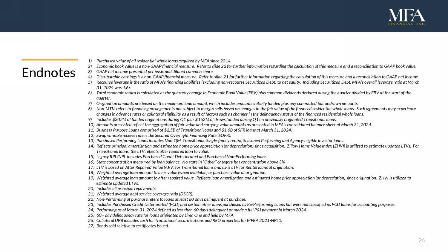 26 Endnotes 1) Purchased value of all residential whole loans acquired by MFA since 2014. 2) Economic book value is a non - GAAP financial measure. Refer to slide 22 for further information regarding the calculation of thi s measure and a reconciliation to GAAP book value. 3) GAAP net income presented per basic and diluted common share. 4) Distributable earnings is a non - GAAP financial measure. Refer to slide 21 for further information regarding the calculation of this measure and a reconciliation to GAAP net income. 5) Recourse leverage is the ratio of MFA’s financing liabilities (excluding non - recourse Securitized Debt) to net equity. Includin g Securitized Debt, MFA’s overall leverage ratio at March 31, 2024 was 4.6x. 6) Total economic return is calculated as the quarterly change in Economic Book Value (EBV) plus common dividends declared durin g t he quarter divided by EBV at the start of the quarter. 7) Origination amounts are based on the maximum loan amount, which includes amounts initially funded plus any committed but undr awn amounts. 8) Non - MTM refers to financing arrangements not subject to margin calls based on changes in the fair value of the financed resident ial whole loans. Such agreements may experience changes in advance rates or collateral eligibility as a result of factors such as changes in the delinquency statu s o f the financed residential whole loans. 9) Includes $302M of funded originations during Q1 plus $163M of draws funded during Q1 on previously originated Transitional lo ans . 10) Amounts presented reflect the aggregation of fair value and carrying value amounts as presented in MFA’s consolidated balance sh eet at March 31, 2024. 11) Business Purpose Loans comprised of $2.5B of Transitional loans and $1.6B of SFR loans at March 31, 2024. 12) Swap variable receive rate is the Secured Overnight Financing Rate (SOFR). 13) Purchased Performing Loans includes Non - QM, Transitional, Single - family rental, Seasoned Performing and Agency - eligible investor loans. 14) Reflects principal amortization and estimated home price appreciation (or depreciation) since acquisition. Zillow Home Value In dex (ZHVI) is utilized to estimate updated LTVs. For Transitional loans, the LTV reflects after repaired loan to value. 15) Legacy RPL/NPL includes Purchased Credit Deteriorated and Purchased Non - Performing loans. 16) State concentration measured by loan balance. No state in “Other” category has concentration above 3%. 17) LTV is based on After Repaired Value (ARV) for Transitional loans and as - is LTV for Rental loans at origination. 18) Weighted average loan amount to as - is value (when available) or purchase value at origination. 19) Weighted average loan amount to after repaired value. Reflects loan amortization and estimated home price appreciation (or d epr eciation) since origination. ZHVI is utilized to estimate updated LTVs. 20) Includes all principal repayments. 21) Weighted average debt service coverage ratio (DSCR). 22) Non - Performing at purchase refers to loans at least 60 days delinquent at purchase. 23) Includes Purchased Credit Deteriorated (PCD) and certain other loans purchased as Re - Performing Loans but were not classified as PCD loans for accounting purposes. 24) Performing as of March 31, 2024 defined as less than 60 days delinquent or made a full P&I payment in March 2024. 25) 60+ day delinquency rate for loans originated by Lima One and held by MFA. 26) Collateral UPB includes cash for Transitional securitizations and REO properties for MFRA 2021 - NPL1. 27) Bonds sold relative to certificates issued.