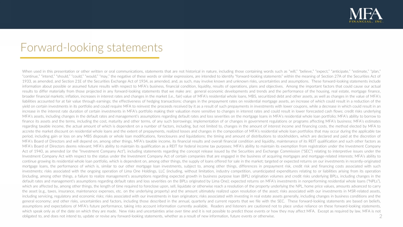 2 Q3 202 2 Financial Snapshot Forward - looking statements When used in this presentation or other written or oral communications, statements that are not historical in nature, including those containing words such as “will,” “believe,” “expect,” “anticipate,” “estimate,” “plan,” “continue,” “intend,” “should,” “could,” “would,” “may,” the negative of these words or similar expressions, are intended to identify “forward - looking statements” within the meaning of Section 27 A of the Securities Act of 1933 , as amended, and Section 21 E of the Securities Exchange Act of 1934 , as amended, and, as such, may involve known and unknown risks, uncertainties and assumptions . These forward - looking statements include information about possible or assumed future results with respect to MFA’s business, financial condition, liquidity, results of operations, plans and objectives . Among the important factors that could cause our actual results to differ materially from those projected in any forward - looking statements that we make are : general economic developments and trends and the performance of the housing, real estate, mortgage finance, broader financial markets ; inflation, increases in interest rates and changes in the market (i . e . , fair) value of MFA’s residential whole loans, MBS, securitized debt and other assets, as well as changes in the value of MFA’s liabilities accounted for at fair value through earnings ; the effectiveness of hedging transactions ; changes in the prepayment rates on residential mortgage assets, an increase of which could result in a reduction of the yield on certain investments in its portfolio and could require MFA to reinvest the proceeds received by it as a result of such prepayments in investments with lower coupons, while a decrease in which could result in an increase in the interest rate duration of certain investments in MFA’s portfolio making their valuation more sensitive to changes in interest rates and could result in lower forecasted cash flows ; credit risks underlying MFA’s assets, including changes in the default rates and management’s assumptions regarding default rates and loss severities on the mortgage loans in MFA’s residential whole loan portfolio ; MFA’s ability to borrow to finance its assets and the terms, including the cost, maturity and other terms, of any such borrowings ; implementation of or changes in government regulations or programs affecting MFA’s business ; MFA’s estimates regarding taxable income, the actual amount of which is dependent on a number of factors, including, but not limited to, changes in the amount of interest income and financing costs, the method elected by MFA to accrete the market discount on residential whole loans and the extent of prepayments, realized losses and changes in the composition of MFA’s residential whole loan portfolios that may occur during the applicable tax period, including gain or loss on any MBS disposals or whole loan modifications, foreclosures and liquidations ; the timing and amount of distributions to stockholders, which are declared and paid at the discretion of MFA’s Board of Directors and will depend on, among other things, MFA’s taxable income, its financial results and overall financial condition and liquidity, maintenance of its REIT qualification and such other factors as MFA’s Board of Directors deems relevant ; MFA’s ability to maintain its qualification as a REIT for federal income tax purposes ; MFA’s ability to maintain its exemption from registration under the Investment Company Act of 1940 , as amended (or the “Investment Company Act”), including statements regarding the concept release issued by the Securities and Exchange Commission (“SEC”) relating to interpretive issues under the Investment Company Act with respect to the status under the Investment Company Act of certain companies that are engaged in the business of acquiring mortgages and mortgage - related interests ; MFA’s ability to continue growing its residential whole loan portfolio, which is dependent on, among other things, the supply of loans offered for sale in the market ; targeted or expected returns on our investments in recently - originated mortgage loans, the performance of which is, similar to our other mortgage loan investments, subject to, among other things, differences in prepayment risk, credit risk and financing costs associated with such investments ; risks associated with the ongoing operation of Lima One Holdings, LLC (including, without limitation, industry competition, unanticipated expenditures relating to or liabilities arising from its operation (including, among other things, a failure to realize management’s assumptions regarding expected growth in business purpose loan (BPL) origination volumes and credit risks underlying BPLs, including changes in the default rates and management’s assumptions regarding default rates and loss severities on the BPLs originated by Lima One) ; expected returns on MFA’s investments in nonperforming residential whole loans (“NPLs”), which are affected by, among other things, the length of time required to foreclose upon, sell, liquidate or otherwise reach a resolution of the property underlying the NPL, home price values, amounts advanced to carry the asset (e . g . , taxes, insurance, maintenance expenses, etc . on the underlying property) and the amount ultimately realized upon resolution of the asset ; risks associated with our investments in MSR - related assets, including servicing, regulatory and economic risks ; risks associated with our investments in loan originators ; risks associated with investing in real estate assets generally, including changes in business conditions and the general economy ; and other risks, uncertainties and factors, including those described in the annual, quarterly and current reports that we file with the S