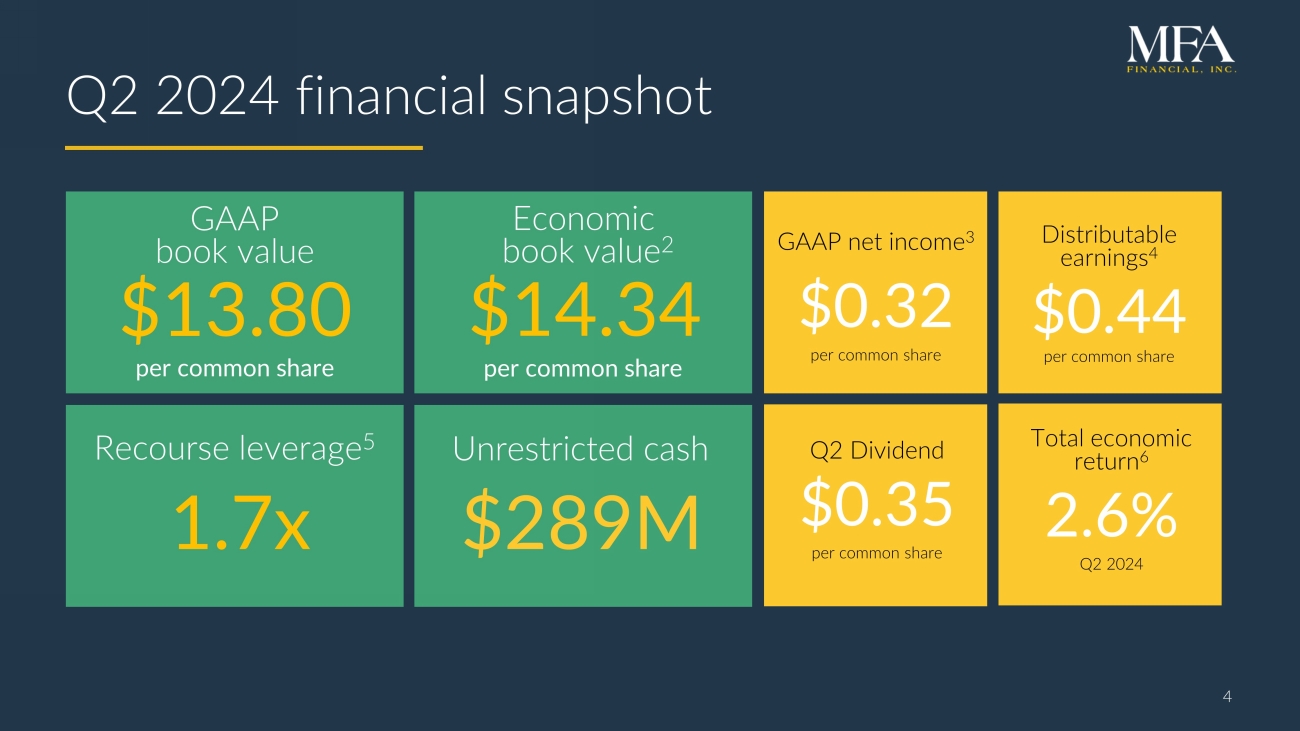 3 v MFA at a glance 3 $1.9B Total equity 1998 Listed on NYSE in Leading hybrid mortgage REIT with extensive experience in managing residential mortgage assets through economic cycles $11.1B Total assets NYSE: MFA $4.7B Common dividends as of June 30, 2024 as of June 30, 2024 paid since IPO See page 27 for endnotes Dividend yield 13.1% as of August 6, 2024 Loans acquired 1 $23B since 2014