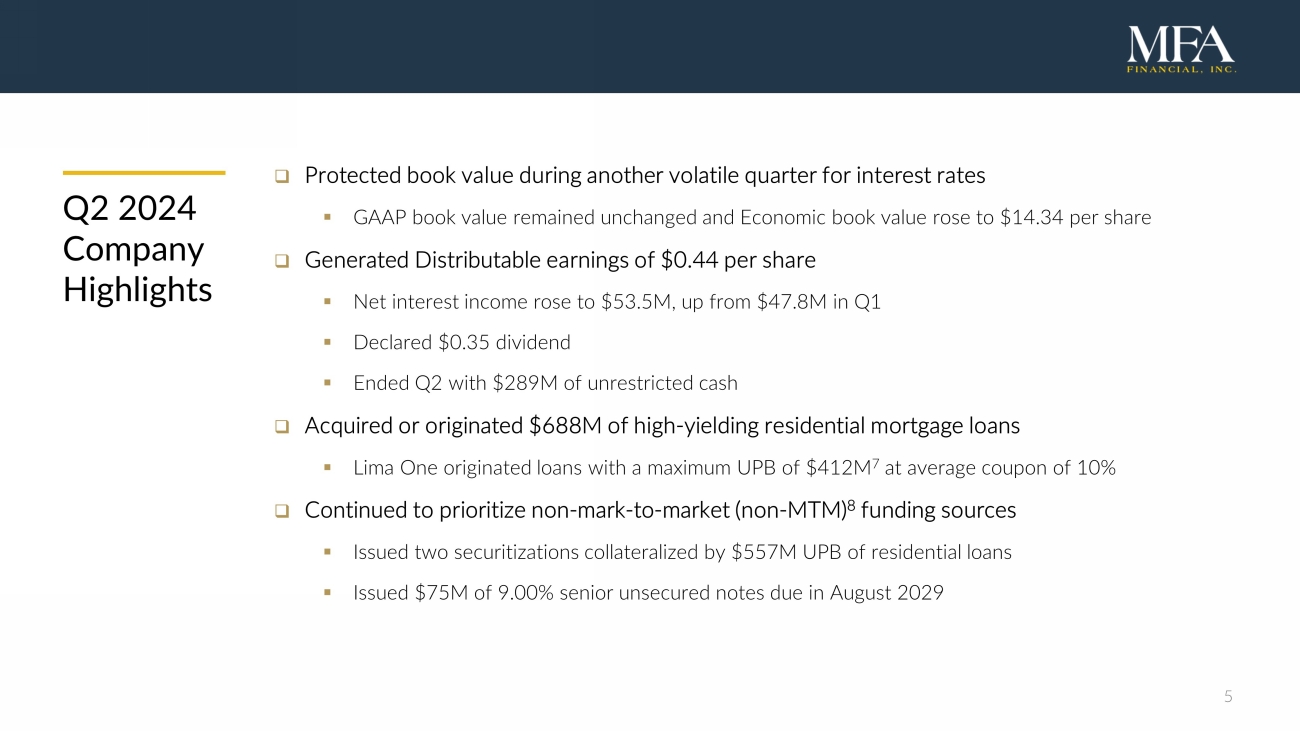 4 Q 2 202 4 financial snapshot $13.80 $14.34 GAAP net income 3 $0.32 per common share Distributable earnings 4 $0.44 per common share GAAP book value Economic book value 2 per common share per common share $289M Unrestricted cash 1.7x Recourse leverage 5 4 Q2 Dividend $0.35 per common share Total economic return 6 2.6% Q2 2024