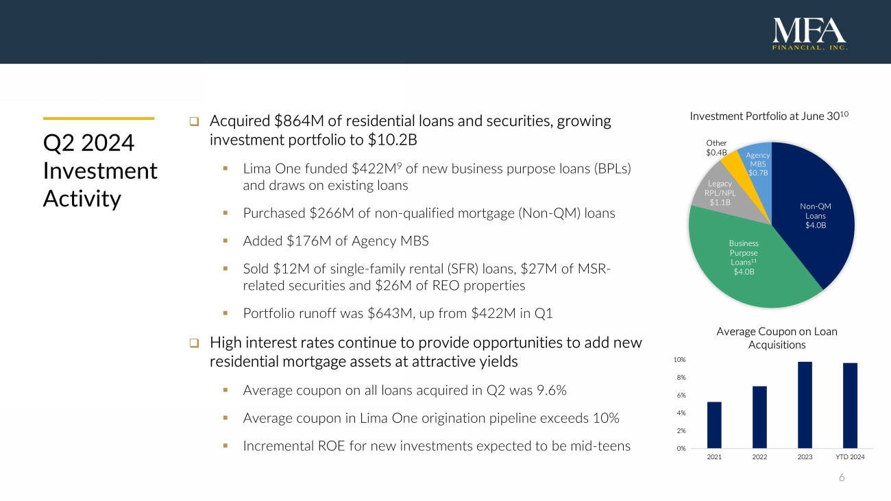 5 Q2 2024 Company Highlights □ Protected book value during another volatile quarter for interest rates ▪ GAAP book value remained unchanged and Economic book value rose to $14.34 per share □ Generated Distributable earnings of $0.44 per share ▪ Net interest income rose to $53.5M, up from $47.8M in Q1 ▪ Declared $0.35 dividend ▪ Ended Q2 with $289M of unrestricted cash □ Acquired or originated $688M of high - yielding residential mortgage loans ▪ Lima One originated loans with a maximum UPB of $412M 7 at average coupon of 10% □ Continued to prioritize non - mark - to - market (non - MTM) 8 funding sources ▪ Issued two securitizations collateralized by $557M UPB of residential loans ▪ Issued $75M of 9.00% senior unsecured notes due in August 2029