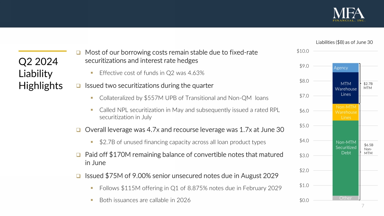 6 □ Acquired $864M of residential loans and securities, growing investment portfolio to $10.2B ▪ Lima One funded $422M 9 of new business purpose loans (BPLs) and draws on existing loans ▪ Purchased $266M of non - qualified mortgage (Non - QM) loans ▪ Added $176M of Agency MBS ▪ Sold $12M of single - family rental (SFR) loans, $27M of MSR - related securities and $26M of REO properties ▪ Portfolio runoff was $643M, up from $422M in Q1 □ High interest rates continue to provide opportunities to add new residential mortgage assets at attractive yields ▪ Average coupon on all loans acquired in Q2 was 9.6% ▪ Average coupon in Lima One origination pipeline exceeds 10% ▪ Incremental ROE for new investments expected to be mid - teens Q2 2024 Investment Activity Investment Portfolio at June 30 10 Non - QM Loans $4.0B Business Purpose Loans 11 $4.0B Legacy RPL/NPL $1.1B Other $0.4B Agency MBS $0.7B 0% 2% 4% 6% 8% 10% 2021 2022 2023 YTD 2024 Average Coupon on Loan Acquisitions