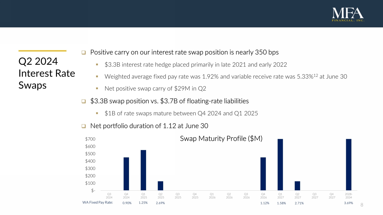 7 Q2 2024 Liability Highlights □ Most of our borrowing costs remain stable due to fixed - rate securitizations and interest rate hedges ▪ Effective cost of funds in Q2 was 4.63% □ Issued two securitizations during the quarter ▪ Collateralized by $557M UPB of Transitional and Non - QM loans ▪ Called NPL securitization in May and subsequently issued a rated RPL securitization in July □ Overall leverage was 4.7x and recourse leverage was 1.7x at June 30 ▪ $2.7B of unused financing capacity across all loan product types □ Paid off $170M remaining balance of convertible notes that matured in June □ Issued $75M of 9.00% senior unsecured notes due in August 2029 ▪ Follows $115M offering in Q1 of 8.875% notes due in February 2029 ▪ Both issuances are callable in 2026 MTM Warehouse Line Non - MTM Warehouse Line Non - MTM Securitized Debt Other MTM Warehouse Lines Other $2.7B MTM $6.5B Non - MTM $0.0 $1.0 $2.0 $3.0 $4.0 $5.0 $6.0 $7.0 $8.0 $9.0 $10.0 Liabilities ($B) as of June 30 Agency MTM Warehouse Lines Non - MTM Warehouse Lines Non - MTM Securitized Debt Other
