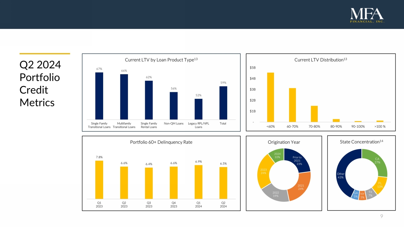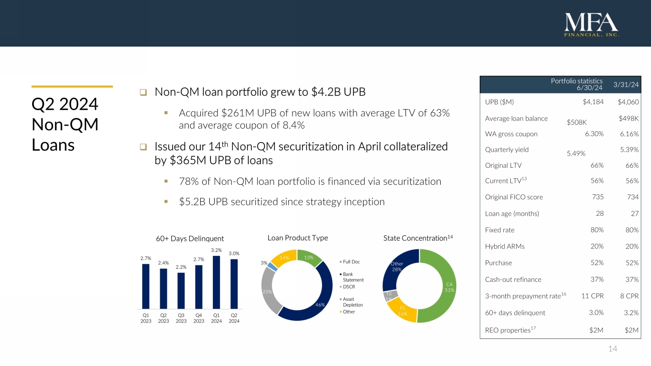 15 Q2 2024 Legacy RPL/NPL Loans □ Achieving favorable outcomes due to home price appreciation and intensive asset management ▪ 95% of Legacy RPL/NPL loans purchased since 2014 ($4.4B UPB) were performing, paid in full (PIF), REO or liquidated as of June 30 ▪ 77% of loans modified by MFA were either performing or PIF ▪ LTV has declined to 52% 13 □ Issued rated securitization in July 2024 collateralized by $303M UPB of primarily re - performing loans P ortfolio s tatistics 6/30/24 3/31/24 UPB ($M) $1,284 $1,325 1 Average loan balance $196K $199K 1 Gross coupon 5.12% 5.06% 1 Quarterly yield 8.72% 7.62% 1 Current LTV 13 52% 53% 1 Original FICO score 647 647 1 Fixed rate 82% 82% 1 Hybrid ARMs 18% 18% 1 24 - month clean pay 44% 43% 1 WA loan age (months) 216 213 1 3 - month prepayment rate 16 11 CPR 9 CPR 1 60+ days delinquent 21.5% 23.1% 1 REO properties 17 $67M $71M 1 CA 22% NY 17% FL 7% NJ 7% MD 5% Other 42% State Concentration 14 29.1% 26.1% 24.6% 23.3% 23.1% 21.5% Q1 2023 Q2 2023 Q3 2023 Q4 2023 Q1 2024 Q2 2024 60+ Days Delinquent PIF 33% Liquidated/REO 33% Performing 29% Non - performing 5% Loan Resolution Status 19