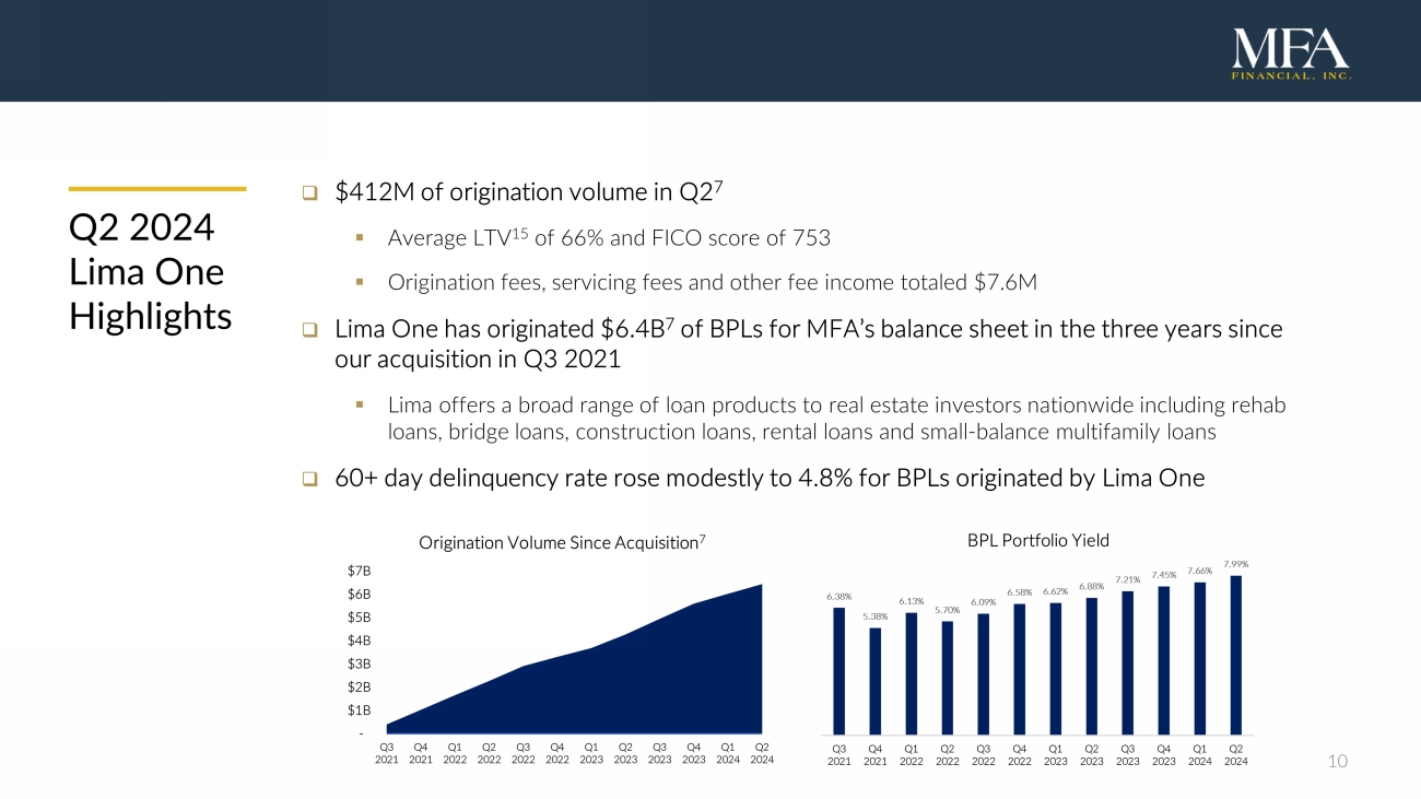 9 Q2 2024 Portfolio Credit Metrics 67% 66% 62% 56% 52% 59% Single Family Transitional Loans Multifamily Transitional Loans Single Family Rental Loans Non-QM Loans Legacy RPL/NPL Loans Total Current LTV by Loan Product Type 13 7.8% 6.6% 6.4% 6.6% 6.9% 6.5% Q1 2023 Q2 2023 Q3 2023 Q4 2023 Q1 2024 Q2 2024 Portfolio 60+ Delinquency Rate Prior to 2021 23% 2021 24% 2022 19% 2023 24% 2024 10% Origination Year - $1B $2B $3B $4B $5B <60% 60-70% 70-80% 80-90% 90-100% >100 % Current LTV Distribution 13 CA 27% FL 13% TX 7% NY 5% GA 5% Other 43% State Concentration 14