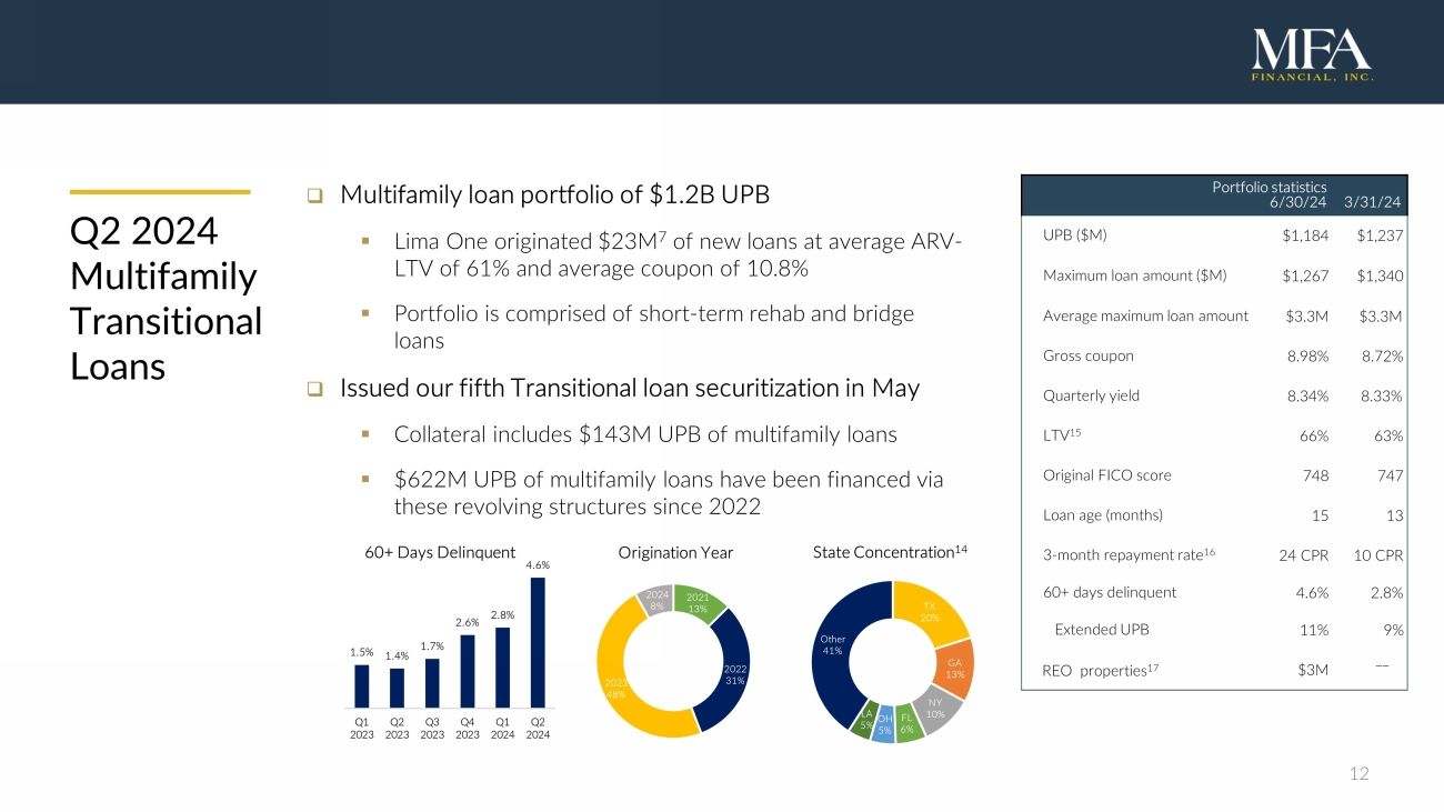 11 Portfolio s tatistics 6/30/24 3/31/24 UPB ($M) $1,227 $1,265 d Maximum loan amount ($M) $1,634 $1,691 Average maximum loan amount $577K $561K d Gross coupon 10.39% 10.18% d Quarterly yield 9.75% 9.04% d LTV 15 67% 66% d Original FICO score 748 746 d Loan age (months) 11 11 d Ground - up construction 39% 40% d 3 - month repayment rate 16 66 CPR 52 CPR d 60+ days delinquent 8.6% 9.3% d REO properties 17 $23M $27M d Q2 2024 Single - family Transitional Loans □ Lima One originated $279M 7 of new loans ▪ Average ARV - LTV of 66% and average coupon of 10.7% □ Issued our fifth Transitional loan securitization in May ▪ Collateral includes $48M UPB of Single - family transitional loans ▪ $1.1B UPB of Single - family transitional loans have been financed via these revolving structures since 2022 7.6% 6.5% 6.7% 7.5% 9.3% 8.6% Q1 2023 Q2 2023 Q3 2023 Q4 2023 Q1 2024 Q2 2024 60+ Days Delinquent FL 17% TX 12% GA 8% CA 7% NC 6% OR 5% Other 45% State Concentration 14 Bridge Loans 28% Ground Up Construction Loans 39% Rehab Loans 33% Loan Product Type
