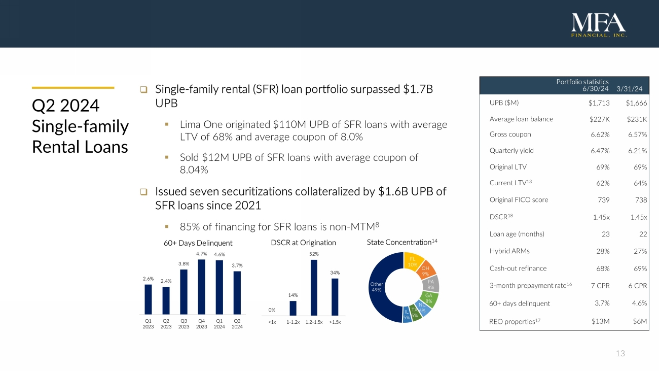 12 Portfolio s tatistics 6/30/24 3/31/24 UPB ($M) $1,184 $1,237 d Maximum loan amount ($M) $1,267 $1,340 d Average maximum loan amount $3.3M $3.3M d Gross coupon 8.98% 8.72% d Quarterly yield 8.34% 8.33% d LTV 15 66% 63% d Original FICO score 748 747 d Loan age (months) 15 13 d 3 - month repayment rate 16 24 CPR 10 CPR d 60+ days delinquent 4.6% 2.8% d Extended UPB 11% 9% s REO properties 17 $3M __ D Q2 2024 Multifamily Transitional Loans □ Multifamily loan portfolio of $1.2B UPB ▪ Lima One originated $23M 7 of new loans at average ARV - LTV of 61% and average coupon of 10.8% ▪ Portfolio is comprised of short - term rehab and bridge loans □ Issued our fifth Transitional loan securitization in May ▪ Collateral includes $143M UPB of multifamily loans ▪ $622M UPB of multifamily loans have been financed via these revolving structures since 2022 TX 20% GA 13% NY 10% FL 6% OH 5% LA 5% Other 41% State Concentration 14 1.5% 1.4% 1.7% 2.6% 2.8% 4.6% Q1 2023 Q2 2023 Q3 2023 Q4 2023 Q1 2024 Q2 2024 60+ Days Delinquent 2021 13% 2022 31% 2023 48% 2024 8% Origination Year