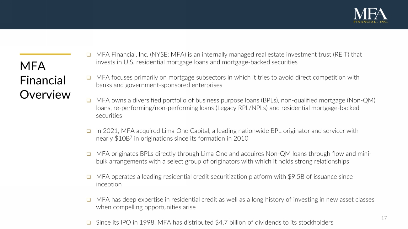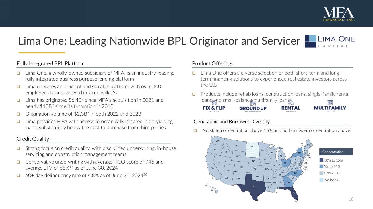 17 MFA Financial Overview □ MFA Financial, Inc. (NYSE: MFA) is an internally managed real estate investment trust (REIT) that invests in U.S. residential mortgage loans and mortgage - backed securities □ MFA focuses primarily on mortgage subsectors in which it tries to avoid direct competition with banks and government - sponsored enterprises □ MFA owns a diversified portfolio of business purpose loans (BPLs), non - qualified mortgage (Non - QM) loans, re - performing/non - performing loans (Legacy RPL/NPLs) and residential mortgage - backed securities □ In 2021, MFA acquired Lima One Capital, a leading nationwide BPL originator and servicer with nearly $10B 7 in originations since its formation in 2010 □ MFA originates BPLs directly through Lima One and acquires Non - QM loans through flow and mini - bulk arrangements with a select group of originators with which it holds strong relationships □ MFA operates a leading residential credit securitization platform with $9.5B of issuance since inception □ MFA has deep expertise in residential credit as well as a long history of investing in new asset classes when compelling opportunities arise □ Since its IPO in 1998, MFA has distributed $4.7 billion of dividends to its stockholders