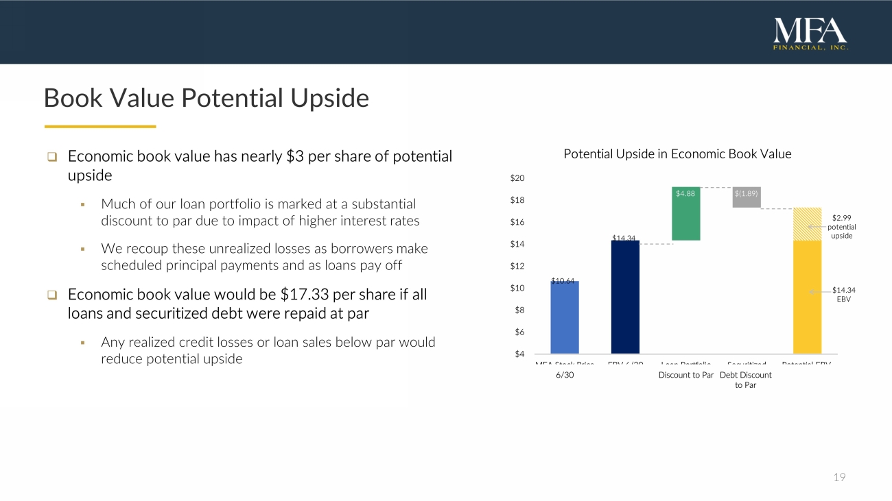 19 Book Value Potential Upside □ Economic book value has nearly $3 per share of potential upside ▪ Much of our loan portfolio is marked at a substantial discount to par due to impact of higher interest rates ▪ We recoup these unrealized losses as borrowers make scheduled principal payments and as loans pay off □ Economic book value would be $17.33 per share if all loans and securitized debt were repaid at par ▪ Any realized credit losses or loan sales below par would reduce potential upside $4.84 $2.99 potential upside $14.34 EBV $4 $6 $8 $10 $12 $14 $16 $18 $20 MFA Stock Price 6/30 EBV 6/30 Loan Portfolio Discount to Par Securitized Debt Discount to Par Potential EBV Potential Upside in Economic Book Value $14.34 $10.64 $4.88 $(1.89)