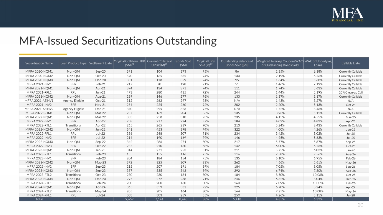 20 MFA - Issued Securitizations Outstanding Securitization Name Loan Product Type Settlement Date Original Collateral UPB ($M) 21 Current Collateral UPB ($M) 21 Bonds Sold ($M) Original UPB Sold (%) 22 Outstanding Balance of Bonds Sold ($M) Weighted Average Coupon (WAC) of Outstanding Bonds Sold WAC of Underlying Loans Callable Date MFRA 2020 - NQM1 Non - QM Sep - 20 391 104 373 95% 86 2.35% 6.18% Currently Callable MFRA 2020 - NQM2 Non - QM Oct - 20 570 165 535 94% 130 2.19% 6.56% Currently Callable MFRA 2020 - NQM3 Non - QM Dec - 20 381 118 359 94% 95 1.84% 5.68% Currently Callable MFRA 2021 - INV1 SFR Feb - 21 217 70 198 91% 51 1.46% 7.19% Currently Callable MFRA 2021 - NQM1 Non - QM Apr - 21 394 134 371 94% 111 1.74% 5.63% Currently Callable MFRA 2021 - RPL1 RPL Jun - 21 473 280 435 92% 244 1.44% 5.19% 20% Clean - up Call MFRA 2021 - NQM2 Non - QM Aug - 21 289 146 277 96% 133 1.37% 5.17% Currently Callable MFRA 2021 - AEINV1 Agency Eligible Oct - 21 312 262 297 95% N/A 1.43% 3.27% N/A MFRA 2021 - INV2 SFR Nov - 21 284 225 260 92% 202 2.20% 5.13% Oct - 24 MFRA 2021 - AEINV2 Agency Eligible Dec - 21 340 295 323 95% N/A 1.52% 3.46% N/A MFRA 2022 - CHM1 Non - QM Mar - 22 237 169 204 86% 135 3.93% 5.11% Currently Callable MFRA 2022 - NQM1 Non - QM Mar - 22 333 258 310 93% 235 4.15% 4.55% Mar - 25 MFRA 2022 - INV1 SFR Apr - 22 258 217 224 87% 184 4.02% 4.83% Apr - 25 MFRA 2022 - RTL1 Transitional Apr - 22 265 265 239 90% 213 5.24% 8.43% Currently Callable MFRA 2022 - NQM2 Non - QM Jun - 22 541 453 398 74% 322 4.00% 4.26% Jun - 25 MFRA 2022 - RPL1 RPL Jul - 22 336 248 307 91% 234 3.42% 5.02% Jul - 25 MFRA 2022 - INV2 SFR Jul - 22 214 190 169 79% 146 4.95% 5.63% Jul - 25 MFRA 2022 - NQM3 Non - QM Sep - 22 342 286 274 80% 217 5.57% 5.87% Sep - 25 MFRA 2022 - INV3 SFR Oct - 22 235 210 160 68% 142 6.00% 6.53% Oct - 25 MFRA 2023 - NQM1 Non - QM Jan - 23 314 271 253 81% 211 5.75% 6.03% Jan - 26 MFRA 2023 - RTL1 Transitional Feb - 23 155 155 116 75% 116 7.58% 9.56% Aug - 24 MFRA 2023 - INV1 SFR Feb - 23 204 184 154 75% 135 6.10% 6.95% Feb - 26 MFRA 2023 - NQM2 Non - QM May - 23 372 325 309 83% 262 4.66% 5.61% May - 26 MFRA 2023 - INV2 SFR Sep - 23 215 207 191 89% 184 7.05% 8.05% Sep - 26 MFRA 2023 - NQM3 Non - QM Sep - 23 387 335 343 89% 292 6.74% 7.80% Aug - 26 MFRA 2023 - RTL2 Transitional Oct - 23 230 230 184 80% 184 8.50% 10.06% Oct - 25 MFRA 2023 - NQM4 Non - QM Dec - 23 295 272 268 91% 246 6.32% 8.04% Dec - 26 MFRA 2024 - RTL1 Transitional Feb - 24 200 200 160 80% 160 7.09% 10.77% Feb - 26 MFRA 2024 - NQM1 Non - QM Apr - 24 365 359 331 92% 325 6.70% 8.24% Apr - 27 MFRA 2024 - RTL2 Transitional May - 24 205 205 164 80% 164 7.25% 10.08% May - 26 MFRA 2024 - RPL1 RPL Jul - 24 303 303 259 85% 259 4.26% 5.11% Jul - 28 Total 9,657 7,141 8,445 88% 5,418 4.85% 6.33%