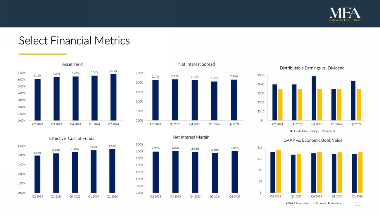 23 Reconciliation of GAAP Book Value to Economic Book Value “Economic book value” is a non - GAAP financial measure of our financial position . To calculate our Economic book value, our portfolios of Residential whole loans and securitized debt held at carrying value are adjusted to their fair value, rather than the carrying value that is required to be reported under the GAAP accounting model applied to these financial instruments . These adjustments are also reflected in the table below in our end of period stockholders’ equity . Management considers that Economic book value provides investors with a useful supplemental measure to evaluate our financial position as it reflects the impact of fair value changes for all of our investment activities, irrespective of the accounting model applied for GAAP reporting purposes . Economic book value does not represent and should not be considered as a substitute for Stockholders’ Equity, as determined in accordance with GAAP, and our calculation of this measure may not be comparable to similarly titled measures reported by other companies . The following table provides a reconciliation of GAAP book value per common share to our non - GAAP Economic book value per common share as of the end of each quarter since Q 2 2023 . ($ i n millions, except per share amounts) 6/30/24 3/31/24 12/31 /2 3 9/30 /2 3 6/30 /2 3 GAAP Total Stockholders’ Equity $ 1,883.2 $ 1,884.2 $ 1,899.9 $ 1,848.5 $ 1,944.8 Preferred Stock, liquidation preference (475.0) (475.0) (475.0) (475.0) (475.0) GAAP Stockholders’ Equity for book value per common share $ 1,408.2 $ 1,409.2 $ 1,424.9 $ 1,373.5 $ 1,469.8 Adjustments: Fair value adjustment to Residential whole loans, at carrying value (26.8) (35.4) (35.6) (85.3) (58.3) Fair value adjustment to Securitized debt, at carrying value 82.3 88.4 95.6 122.5 129.8 Stockholders’ Equity including fair value adjustments to Residential whole loans and Securitized debt held at carrying value (Economic book value ) $ 1,463.7 $ 1,462.2 $ 1,484.9 $ 1,410.7 $ 1,541.3 GAAP book value per common share $ 13.80 $ 13.80 $ 13.98 $ 13.48 $ 14.42 Economic book value per common share $ 14.34 $ 14.32 $ 14.57 $ 13.84 $ 15.12 Number of shares of common stock outstanding 102.1 102.1 101.9 101.9 101.9