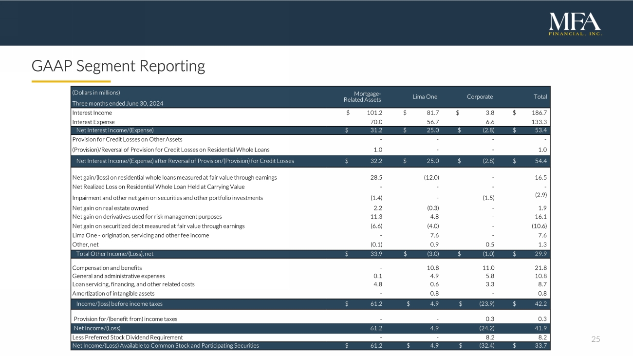 25 GAAP Segment Reporting (Dollars in m illions) Mortgage - Related Assets Lima One Corporate Total d Three months ended June 30, 2024 Interest Income $ 101.2 $ 81.7 $ 3.8 $ 186.7 1 Interest Expense 70.0 56.7 6.6 133.3 1 Net Interest Income /(Expense) $ 31.2 $ 25.0 $ (2.8) $ 53.4 1 Provision for Credit Losses on Other Assets - - - - 1 (Provision)/Reversal of Provision for Credit Losses on Residential Whole Loans 1.0 - - 1.0 1 Net Interest Income /(Expense) after Reversal of Provision/( Provision ) for Credit Losses $ 32.2 $ 25.0 $ (2.8) $ 54.4 4 Net gain/(loss) on residential whole loans measured at fair value through earnings 28.5 (12.0) - 16.5 1 Net Realized Loss on Residential Whole Loan Held at Carrying Value - - - - 1 Impairment and other net gain on securities and other portfolio investments (1.4) - (1.5) (2.9) 1 Net gain on real estate owned 2.2 (0.3) - 1.9 1 Net gain on derivatives used for risk management purposes 11.3 4.8 - 16.1 1 Net gain on securitized debt measured at fair value through earnings (6.6) (4.0) - (10.6) 1 Lima One - origination, servicing and other fee income - 7.6 - 7.6 1 Other, net (0.1) 0.9 0.5 1.3 1 Total Other Income/(Loss) , net $ 33.9 $ (3.0) $ (1.0) $ 29.9 1 Compensation and benefits - 10.8 11.0 21.8 1 General and administrative expenses 0.1 4.9 5.8 10.8 1 Loan servicing, financing, and other related costs 4.8 0.6 3.3 8.7 1 Amortization of intangible assets - 0.8 - 0.8 1 Income/(loss) before income taxes $ 61.2 $ 4.9 $ (23.9) $ 42.2 1 Provision for/(benefit from) income taxes - - 0.3 0.3 1 Net Income/(Loss) 61.2 4.9 (24.2) 41.9 1 Less Preferred Stock Dividend Requirement - - 8.2 8.2 1 Net Income/( Loss ) Available to Common Stock and Participating Securities $ 61.2 $ 4.9 $ (32.4) $ 33.7 1