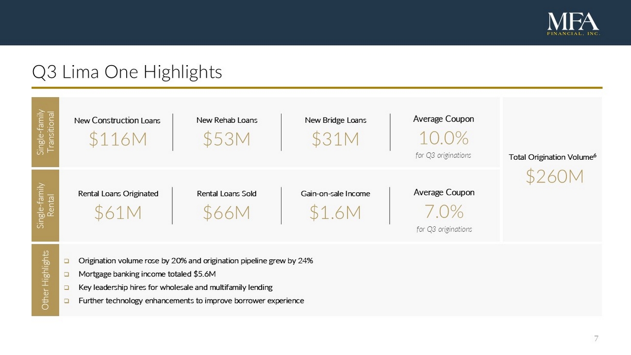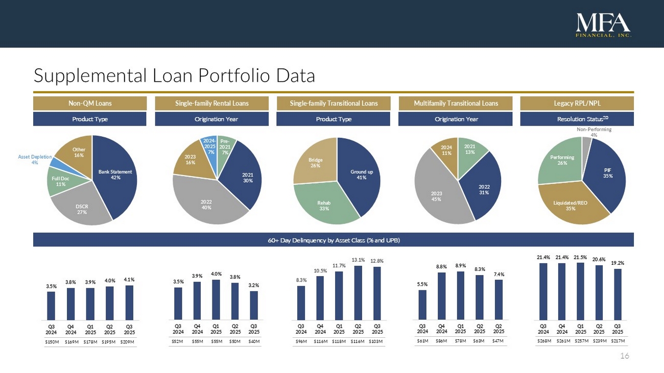 9 Q3 202 2 Financial Snapshot Q3 Loan Portfolio Statistics Total 9 Legacy RPL/NPL Loans Multifamily Transitional Loans Single - family Transitional Loans Single - family Rental Loans Non - QM Loans as of Sept. 30, 2025 Portfolio Statistics $9.0B $1.13B $636M $804M $1.27B $5.12B UPB $380K $190K $3.4M $425K $227K $516K Average loan balance 7.13% 5.11% 9.95% 10.40% 6.36% 6.86% Gross coupon 6.81% 8.55% 8.72% 9.09% 6.64% 5.95% Quarterly yield 60% 50% 64% 69% 60% 60% LTV 10 729 647 752 749 740 738 Original FICO score 55 231 29 12 39 30 Loan age (months) 20 CPR 9 CPR 45 CPR 70 CPR 12 CPR 13 CPR 3 - month prepayment rate 12 6.8% 19.2% 7.4% 12.8% 3.2% 4.1% 60+ days delinquent $138M $45M $27M $43M $15M $8M REO properties 13 as of Sept. 30, 2025 Additional Statistics $297M - $30M $267M - - Unfunded Commitments 14 86% 84% 100% 100% 75% 85% Fixed rate 14% 16% - - 25% 15% Hybrid ARMs 46% 34% 70% 43% 17% 53% Purchase 37% 34% 12% 15% 70% 36% Cash - out refinance 7% - 57% 31% - - Extended UPB 15 □ Non - QM Loans: ▪ Acquired $453M of new loans with average LTV of 68% and average coupon of 7.6% ▪ Issued securitizations in August and September collateralized by $721M UPB of loans □ Single - family Rental Loans: ▪ Lima One originated $61M of loans with average LTV of 68% and average coupon of 7.0% ▪ Sold $66M of newly - originated loans □ Single - family Transitional Loans: ▪ Lima One originated $200M of new loans 6 ▪ $236M of loan repayments □ Multifamily Transitional Loans: ▪ L ending remains paused ▪ $103M of loan repayments ▪ Resolved $34M of previously delinquent loans in Q3, incurring $1M of credit losses □ Legacy RPL/NPL Loans: ▪ 60+ day delinquency rate declined again to new all - time low Q3 2025 Highlights
