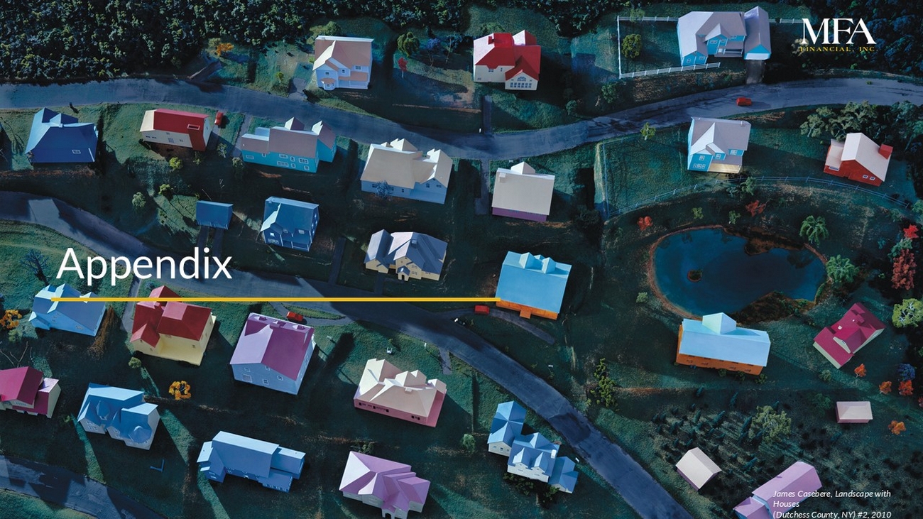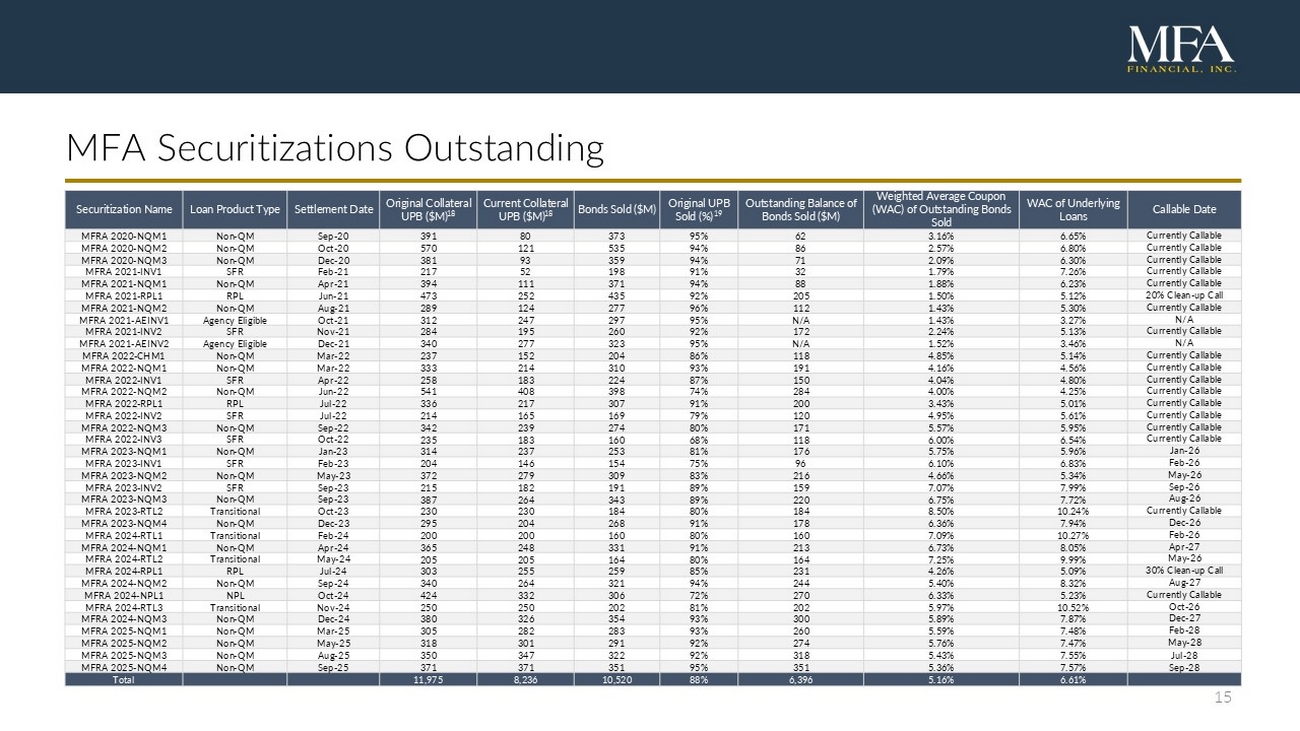 14 Select Financial Metrics $- $3 $6 $9 $12 $15 MFA Stock Price 11/4 EBV 9/30 Loan Portfolio Discount to Par Securitized Debt Discount to Par Potential EBV $13.69 $1.48 $(0. 89 ) $0.59 potential upside $13.69 EBV $9.12 Asset Yield Net Interest Spread GAAP vs. Economic Book Value Effective Cost of Funds Net Interest Margin Potential Upside in Economic Book Value 17 $14.28 6.71% 6.46% 6.52% 6.66% 6.50% 0.00% 1.00% 2.00% 3.00% 4.00% 5.00% 6.00% 7.00% Q3 2024 Q4 2024 Q1 2025 Q2 2025 Q3 2025 2.18% 1.99% 1.84% 1.98% 1.86% 0.00% 0.50% 1.00% 1.50% 2.00% 2.50% Q3 2024 Q4 2024 Q1 2025 Q2 2025 Q3 2025 3.00% 2.76% 2.63% 2.73% 2.57% 0.00% 0.50% 1.00% 1.50% 2.00% 2.50% 3.00% Q3 2024 Q4 2024 Q1 2025 Q2 2025 Q3 2025 4.53% 4.47% 4.68% 4.68% 4.64% 0.00% 1.00% 2.00% 3.00% 4.00% 5.00% Q3 2024 Q4 2024 Q1 2025 Q2 2025 Q3 2025 $- $3 $6 $9 $12 $15 Q3 2024 Q4 2024 Q1 2025 Q2 2025 Q3 2025 GAAP Book Value Economic Book Value