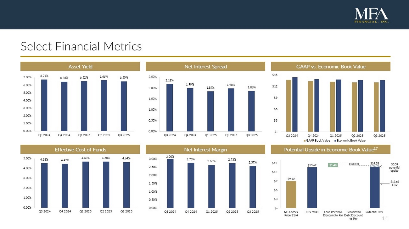 13 □ No state concentration above 15% and no borrower concentration above 2% □ Lima One is an industry - leading business purpose lender wholly - owned by MFA and headquartered in Greenville, S.C. □ Lima operates an efficient and scalable platform with over 250 employees, including in - house sales, underwriting, servicing and construction management teams □ Lima provides MFA with access to organically - created, high - yielding loans, substantially below the cost to purchase from third - party lenders □ Lima has originated over $7 B since MFA’s acquisition in 2021 and over $10B since its formation in 2010 6 Lima One: Leading Nationwide BPL Originator and Servicer Fully Integrated BPL Platform □ Lima One offers a diverse selection of both short - term and long - term financing solutions to experienced real estate investors across the U.S. □ Products have included rehab loans, construction loans, bridge loans, single - family rental loans and small - balance multifamily loans Product Offerings Origination Volume Since MFA’s Acquisition Geographic and Borrower Diversity Concentration 10% to 15% 5% to 10% Below 5% No loans - $1B $2B $3B $4B $5B $6B $7B $8B Q3 2021 Q4 2021 Q1 2022 Q2 2022 Q3 2022 Q4 2022 Q1 2023 Q2 2023 Q3 2023 Q4 2023 Q1 2024 Q2 2024 Q3 2024 Q4 2024 Q1 2025 Q2 2025 Q3 2025 TX FL