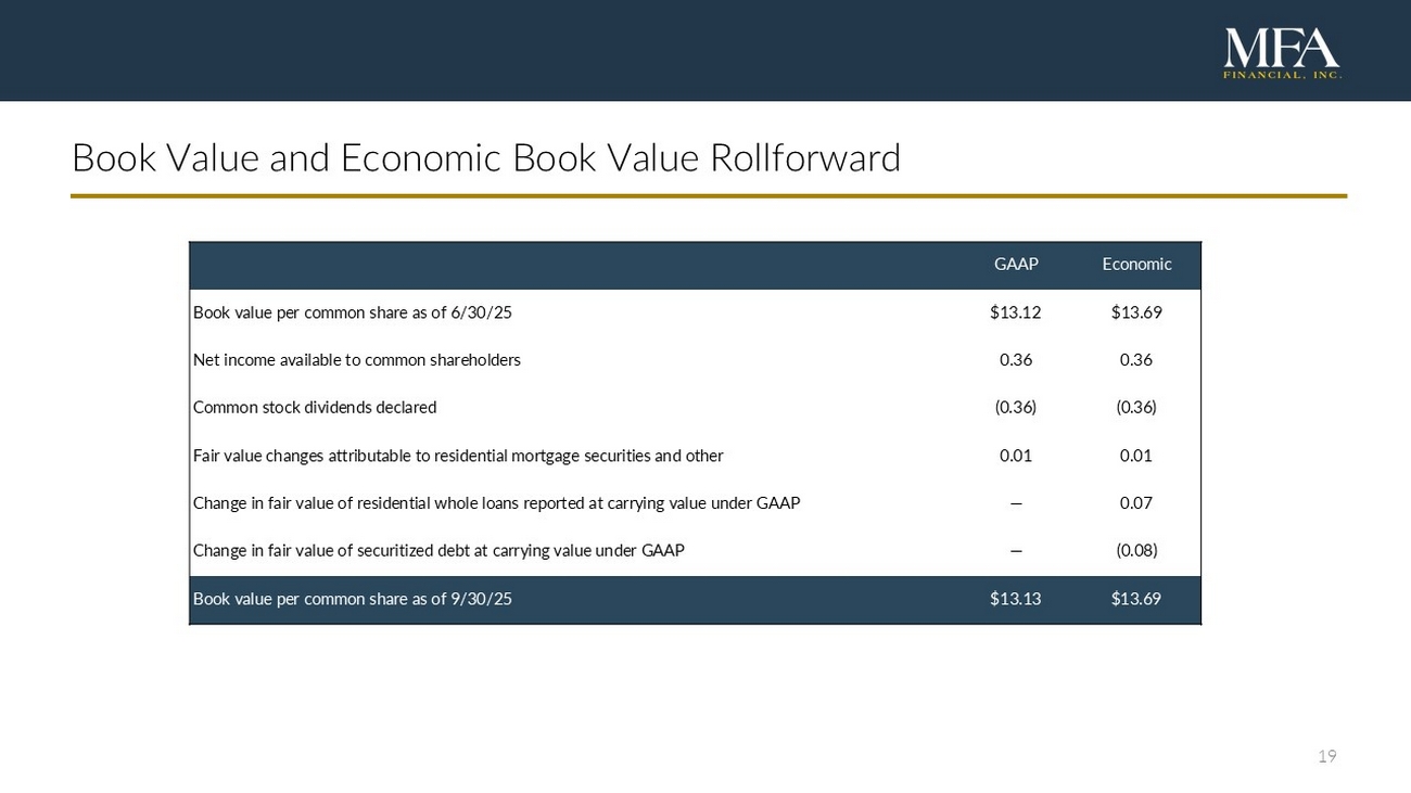 18 Reconciliation of GAAP Book Value to Economic Book Value “Economic book value” is a non - GAAP financial measure of our financial position . To calculate our Economic book value, our portfolios of Residential whole loans and securitized debt held at carrying value are adjusted to their fair value, rather than the carrying value that is required to be reported under the GAAP accounting model applied to these financial instruments . These adjustments are also reflected in the table below in our end of period stockholders’ equity . Management considers that Economic book value provides investors with a useful supplemental measure to evaluate our financial position as it reflects the impact of fair value changes for all of our investment activities, irrespective of the accounting model applied for GAAP reporting purposes . Economic book value does not represent and should not be considered as a substitute for Stockholders’ Equity, as determined in accordance with GAAP, and our calculation of this measure may not be comparable to similarly titled measures reported by other companies . The following table provides a reconciliation of GAAP book value per common share to our non - GAAP Economic book value per common share as of the end of each quarter since Q 3 2024 . 9/30/24 12/31/24 3/31/25 6/30/25 9/30/25 ($ i n millions, except per share amounts) $1,880.5 $1,841.8 $1,838.4 $1,822.1 $1,821.5 GAAP Total Stockholders’ Equity (475.0) (475.0) (475.0) (475.0) (479.9) Preferred Stock, liquidation preference $1,405.5 $1,366.8 $1,363.4 $1,347.1 $1,341.6 GAAP Stockholders’ Equity for book value per common share Adjustments: 6.7 (15.3) (6.3) 1.8 8.7 Fair value adjustment to Residential whole loans, at carrying value 64.3 70.3 63.1 57.1 48.5 Fair value adjustment to Securitized debt, at carrying value $1,476.5 $1,421.8 $1,420.2 $1,406.0 $1,398.8 Stockholders’ Equity including fair value adjustments to Residential whole loans and Securitized debt held at carrying value (Economic book value ) $13.77 $13.39 $13.28 $13.12 $13.13 GAAP book value per common share $14.46 $13.93 $13.84 $13.69 $13.69 Economic book value per common share 102.1 102.1 102.7 102.7 102.2 Number of shares of common stock outstanding