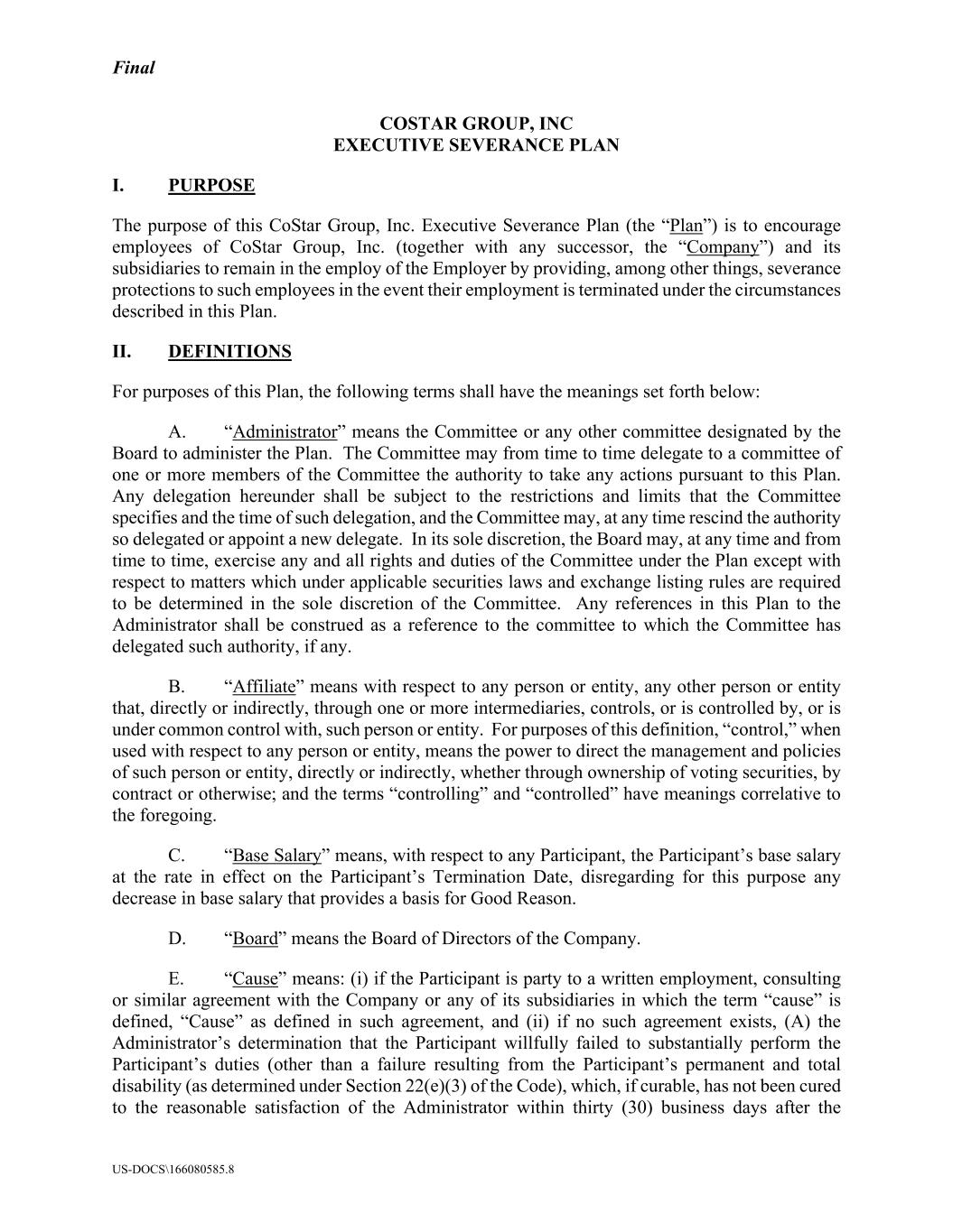 Final US-DOCS\166080585.8 COSTAR GROUP, INC EXECUTIVE SEVERANCE PLAN I. PURPOSE The purpose of this CoStar Group, Inc. Executive Severance Plan (the “Plan”) is to encourage employees of CoStar Group, Inc. (together with any successor, the “Company”) and its subsidiaries to remain in the employ of the Employer by providing, among other things, severance protections to such employees in the event their employment is terminated under the circumstances described in this Plan. II. DEFINITIONS For purposes of this Plan, the following terms shall have the meanings set forth below: A. “Administrator” means the Committee or any other committee designated by the Board to administer the Plan. The Committee may from time to time delegate to a committee of one or more members of the Committee the authority to take any actions pursuant to this Plan. Any delegation hereunder shall be subject to the restrictions and limits that the Committee specifies and the time of such delegation, and the Committee may, at any time rescind the authority so delegated or appoint a new delegate. In its sole discretion, the Board may, at any time and from time to time, exercise any and all rights and duties of the Committee under the Plan except with respect to matters which under applicable securities laws and exchange listing rules are required to be determined in the sole discretion of the Committee. Any references in this Plan to the Administrator shall be construed as a reference to the committee to which the Committee has delegated such authority, if any. B. “Affiliate” means with respect to any person or entity, any other person or entity that, directly or indirectly, through one or more intermediaries, controls, or is controlled by, or is under common control with, such person or entity. For purposes of this definition, “control,” when used with respect to any person or entity, means the power to direct the management and policies of such person or entity, directly or indirectly, whether through ownership of voting securities, by contract or otherwise; and the terms “controlling” and “controlled” have meanings correlative to the foregoing. C. “Base Salary” means, with respect to any Participant, the Participant’s base salary at the rate in effect on the Participant’s Termination Date, disregarding for this purpose any decrease in base salary that provides a basis for Good Reason. D. “Board” means the Board of Directors of the Company. E. “Cause” means: (i) if the Participant is party to a written employment, consulting or similar agreement with the Company or any of its subsidiaries in which the term “cause” is defined, “Cause” as defined in such agreement, and (ii) if no such agreement exists, (A) the Administrator’s determination that the Participant willfully failed to substantially perform the Participant’s duties (other than a failure resulting from the Participant’s permanent and total disability (as determined under Section 22(e)(3) of the Code), which, if curable, has not been cured to the reasonable satisfaction of the Administrator within thirty (30) business days after the