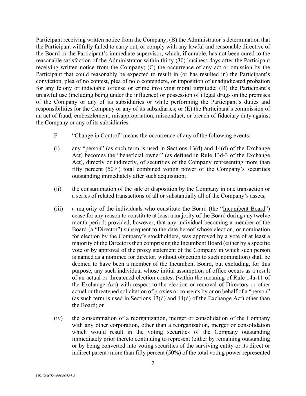 2 US-DOCS\166080585.8 Participant receiving written notice from the Company; (B) the Administrator’s determination that the Participant willfully failed to carry out, or comply with any lawful and reasonable directive of the Board or the Participant’s immediate supervisor, which, if curable, has not been cured to the reasonable satisfaction of the Administrator within thirty (30) business days after the Participant receiving written notice from the Company; (C) the occurrence of any act or omission by the Participant that could reasonably be expected to result in (or has resulted in) the Participant’s conviction, plea of no contest, plea of nolo contendere, or imposition of unadjudicated probation for any felony or indictable offense or crime involving moral turpitude; (D) the Participant’s unlawful use (including being under the influence) or possession of illegal drugs on the premises of the Company or any of its subsidiaries or while performing the Participant’s duties and responsibilities for the Company or any of its subsidiaries; or (E) the Participant’s commission of an act of fraud, embezzlement, misappropriation, misconduct, or breach of fiduciary duty against the Company or any of its subsidiaries. F. “Change in Control” means the occurrence of any of the following events: (i) any “person” (as such term is used in Sections 13(d) and 14(d) of the Exchange Act) becomes the “beneficial owner” (as defined in Rule 13d-3 of the Exchange Act), directly or indirectly, of securities of the Company representing more than fifty percent (50%) total combined voting power of the Company’s securities outstanding immediately after such acquisition; (ii) the consummation of the sale or disposition by the Company in one transaction or a series of related transactions of all or substantially all of the Company’s assets; (iii) a majority of the individuals who constitute the Board (the “Incumbent Board”) cease for any reason to constitute at least a majority of the Board during any twelve month period; provided, however, that any individual becoming a member of the Board (a “Director”) subsequent to the date hereof whose election, or nomination for election by the Company’s stockholders, was approved by a vote of at least a majority of the Directors then comprising the Incumbent Board (either by a specific vote or by approval of the proxy statement of the Company in which such person is named as a nominee for director, without objection to such nomination) shall be deemed to have been a member of the Incumbent Board, but excluding, for this purpose, any such individual whose initial assumption of office occurs as a result of an actual or threatened election contest (within the meaning of Rule 14a-11 of the Exchange Act) with respect to the election or removal of Directors or other actual or threatened solicitation of proxies or consents by or on behalf of a “person” (as such term is used in Sections 13(d) and 14(d) of the Exchange Act) other than the Board; or (iv) the consummation of a reorganization, merger or consolidation of the Company with any other corporation, other than a reorganization, merger or consolidation which would result in the voting securities of the Company outstanding immediately prior thereto continuing to represent (either by remaining outstanding or by being converted into voting securities of the surviving entity or its direct or indirect parent) more than fifty percent (50%) of the total voting power represented