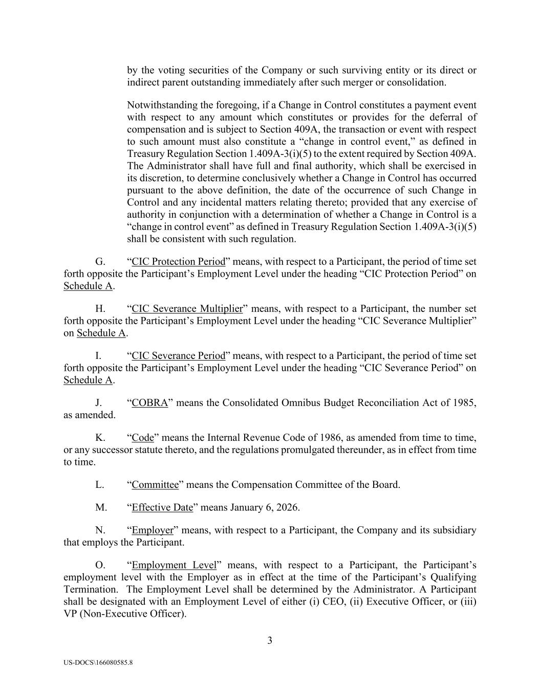 3 US-DOCS\166080585.8 by the voting securities of the Company or such surviving entity or its direct or indirect parent outstanding immediately after such merger or consolidation. Notwithstanding the foregoing, if a Change in Control constitutes a payment event with respect to any amount which constitutes or provides for the deferral of compensation and is subject to Section 409A, the transaction or event with respect to such amount must also constitute a “change in control event,” as defined in Treasury Regulation Section 1.409A-3(i)(5) to the extent required by Section 409A. The Administrator shall have full and final authority, which shall be exercised in its discretion, to determine conclusively whether a Change in Control has occurred pursuant to the above definition, the date of the occurrence of such Change in Control and any incidental matters relating thereto; provided that any exercise of authority in conjunction with a determination of whether a Change in Control is a “change in control event” as defined in Treasury Regulation Section 1.409A-3(i)(5) shall be consistent with such regulation. G. “CIC Protection Period” means, with respect to a Participant, the period of time set forth opposite the Participant’s Employment Level under the heading “CIC Protection Period” on Schedule A. H. “CIC Severance Multiplier” means, with respect to a Participant, the number set forth opposite the Participant’s Employment Level under the heading “CIC Severance Multiplier” on Schedule A. I. “CIC Severance Period” means, with respect to a Participant, the period of time set forth opposite the Participant’s Employment Level under the heading “CIC Severance Period” on Schedule A. J. “COBRA” means the Consolidated Omnibus Budget Reconciliation Act of 1985, as amended. K. “Code” means the Internal Revenue Code of 1986, as amended from time to time, or any successor statute thereto, and the regulations promulgated thereunder, as in effect from time to time. L. “Committee” means the Compensation Committee of the Board. M. “Effective Date” means January 6, 2026. N. “Employer” means, with respect to a Participant, the Company and its subsidiary that employs the Participant. O. “Employment Level” means, with respect to a Participant, the Participant’s employment level with the Employer as in effect at the time of the Participant’s Qualifying Termination. The Employment Level shall be determined by the Administrator. A Participant shall be designated with an Employment Level of either (i) CEO, (ii) Executive Officer, or (iii) VP (Non-Executive Officer).