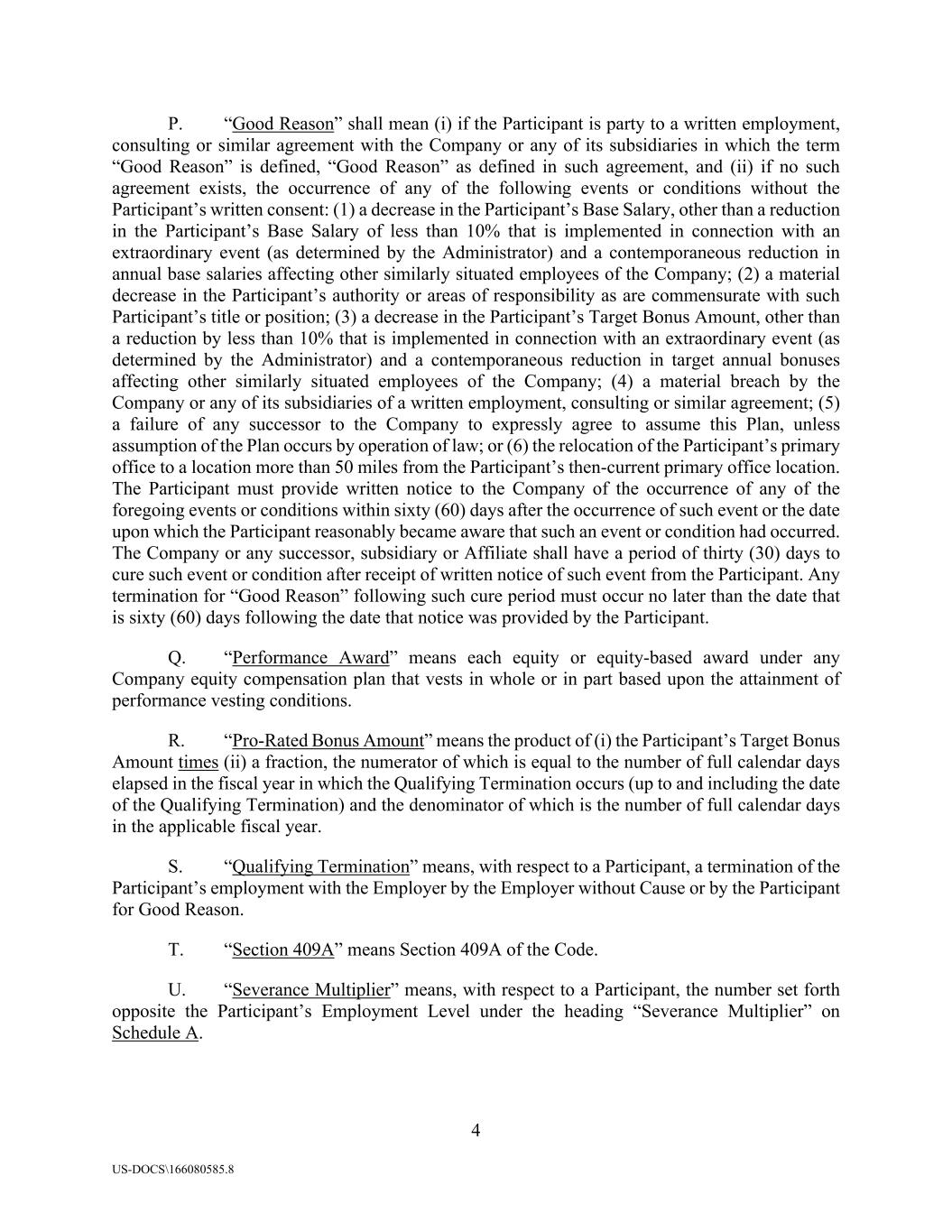 4 US-DOCS\166080585.8 P. “Good Reason” shall mean (i) if the Participant is party to a written employment, consulting or similar agreement with the Company or any of its subsidiaries in which the term “Good Reason” is defined, “Good Reason” as defined in such agreement, and (ii) if no such agreement exists, the occurrence of any of the following events or conditions without the Participant’s written consent: (1) a decrease in the Participant’s Base Salary, other than a reduction in the Participant’s Base Salary of less than 10% that is implemented in connection with an extraordinary event (as determined by the Administrator) and a contemporaneous reduction in annual base salaries affecting other similarly situated employees of the Company; (2) a material decrease in the Participant’s authority or areas of responsibility as are commensurate with such Participant’s title or position; (3) a decrease in the Participant’s Target Bonus Amount, other than a reduction by less than 10% that is implemented in connection with an extraordinary event (as determined by the Administrator) and a contemporaneous reduction in target annual bonuses affecting other similarly situated employees of the Company; (4) a material breach by the Company or any of its subsidiaries of a written employment, consulting or similar agreement; (5) a failure of any successor to the Company to expressly agree to assume this Plan, unless assumption of the Plan occurs by operation of law; or (6) the relocation of the Participant’s primary office to a location more than 50 miles from the Participant’s then-current primary office location. The Participant must provide written notice to the Company of the occurrence of any of the foregoing events or conditions within sixty (60) days after the occurrence of such event or the date upon which the Participant reasonably became aware that such an event or condition had occurred. The Company or any successor, subsidiary or Affiliate shall have a period of thirty (30) days to cure such event or condition after receipt of written notice of such event from the Participant. Any termination for “Good Reason” following such cure period must occur no later than the date that is sixty (60) days following the date that notice was provided by the Participant. Q. “Performance Award” means each equity or equity-based award under any Company equity compensation plan that vests in whole or in part based upon the attainment of performance vesting conditions. R. “Pro-Rated Bonus Amount” means the product of (i) the Participant’s Target Bonus Amount times (ii) a fraction, the numerator of which is equal to the number of full calendar days elapsed in the fiscal year in which the Qualifying Termination occurs (up to and including the date of the Qualifying Termination) and the denominator of which is the number of full calendar days in the applicable fiscal year. S. “Qualifying Termination” means, with respect to a Participant, a termination of the Participant’s employment with the Employer by the Employer without Cause or by the Participant for Good Reason. T. “Section 409A” means Section 409A of the Code. U. “Severance Multiplier” means, with respect to a Participant, the number set forth opposite the Participant’s Employment Level under the heading “Severance Multiplier” on Schedule A.