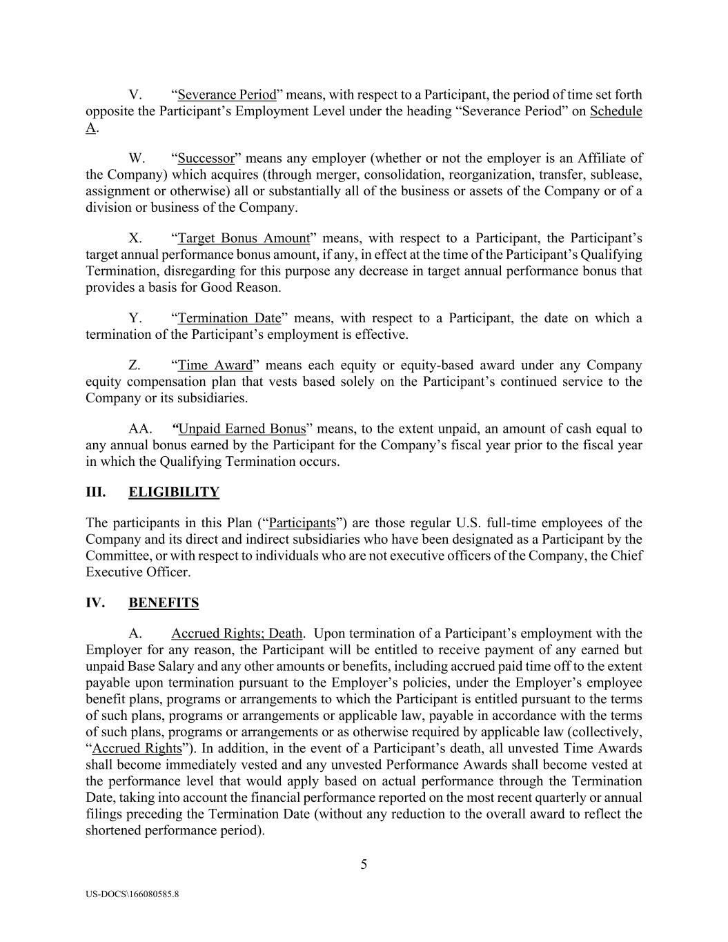 5 US-DOCS\166080585.8 V. “Severance Period” means, with respect to a Participant, the period of time set forth opposite the Participant’s Employment Level under the heading “Severance Period” on Schedule A. W. “Successor” means any employer (whether or not the employer is an Affiliate of the Company) which acquires (through merger, consolidation, reorganization, transfer, sublease, assignment or otherwise) all or substantially all of the business or assets of the Company or of a division or business of the Company. X. “Target Bonus Amount” means, with respect to a Participant, the Participant’s target annual performance bonus amount, if any, in effect at the time of the Participant’s Qualifying Termination, disregarding for this purpose any decrease in target annual performance bonus that provides a basis for Good Reason. Y. “Termination Date” means, with respect to a Participant, the date on which a termination of the Participant’s employment is effective. Z. “Time Award” means each equity or equity-based award under any Company equity compensation plan that vests based solely on the Participant’s continued service to the Company or its subsidiaries. AA. “Unpaid Earned Bonus” means, to the extent unpaid, an amount of cash equal to any annual bonus earned by the Participant for the Company’s fiscal year prior to the fiscal year in which the Qualifying Termination occurs. III. ELIGIBILITY The participants in this Plan (“Participants”) are those regular U.S. full-time employees of the Company and its direct and indirect subsidiaries who have been designated as a Participant by the Committee, or with respect to individuals who are not executive officers of the Company, the Chief Executive Officer. IV. BENEFITS A. Accrued Rights; Death. Upon termination of a Participant’s employment with the Employer for any reason, the Participant will be entitled to receive payment of any earned but unpaid Base Salary and any other amounts or benefits, including accrued paid time off to the extent payable upon termination pursuant to the Employer’s policies, under the Employer’s employee benefit plans, programs or arrangements to which the Participant is entitled pursuant to the terms of such plans, programs or arrangements or applicable law, payable in accordance with the terms of such plans, programs or arrangements or as otherwise required by applicable law (collectively, “Accrued Rights”). In addition, in the event of a Participant’s death, all unvested Time Awards shall become immediately vested and any unvested Performance Awards shall become vested at the performance level that would apply based on actual performance through the Termination Date, taking into account the financial performance reported on the most recent quarterly or annual filings preceding the Termination Date (without any reduction to the overall award to reflect the shortened performance period).