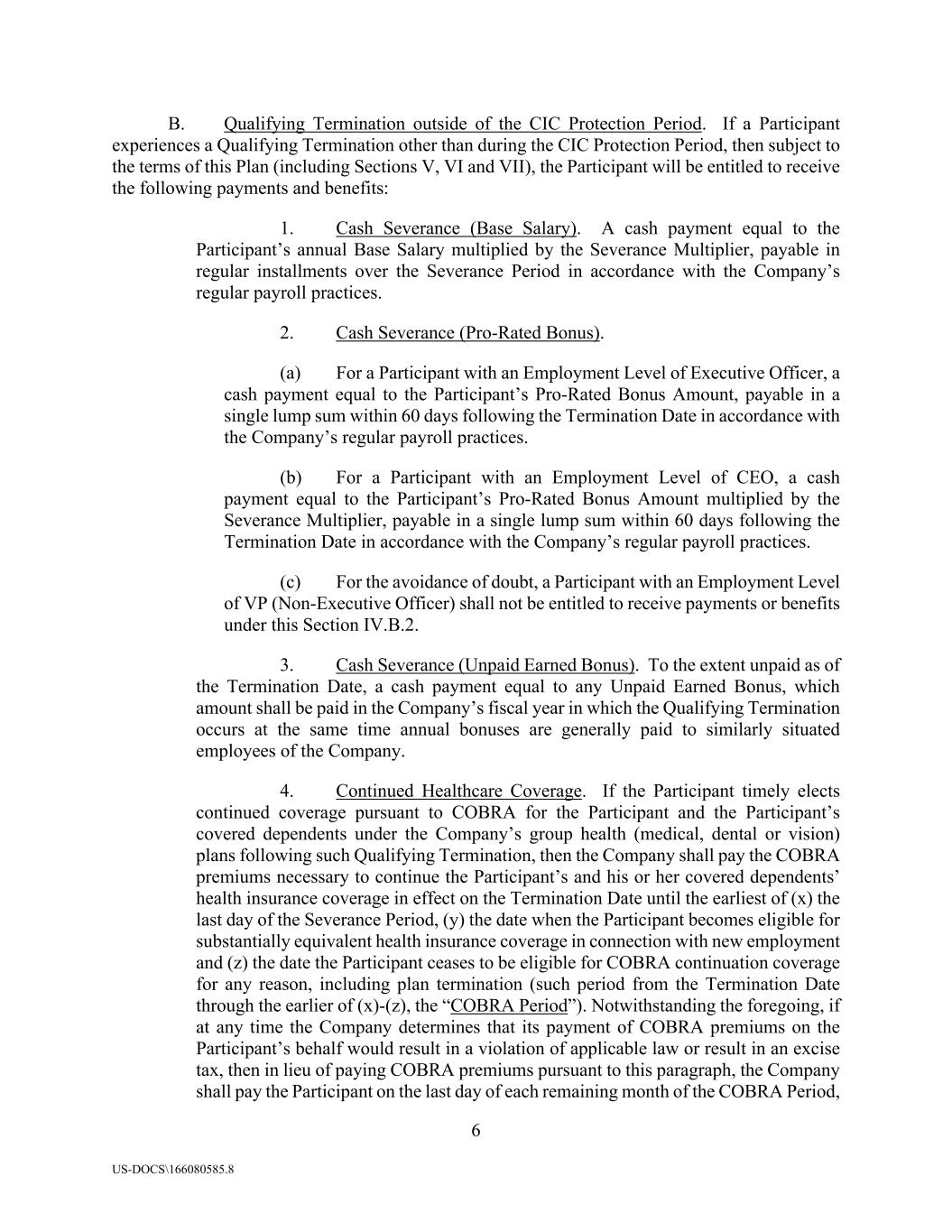 6 US-DOCS\166080585.8 B. Qualifying Termination outside of the CIC Protection Period. If a Participant experiences a Qualifying Termination other than during the CIC Protection Period, then subject to the terms of this Plan (including Sections V, VI and VII), the Participant will be entitled to receive the following payments and benefits: 1. Cash Severance (Base Salary). A cash payment equal to the Participant’s annual Base Salary multiplied by the Severance Multiplier, payable in regular installments over the Severance Period in accordance with the Company’s regular payroll practices. 2. Cash Severance (Pro-Rated Bonus). (a) For a Participant with an Employment Level of Executive Officer, a cash payment equal to the Participant’s Pro-Rated Bonus Amount, payable in a single lump sum within 60 days following the Termination Date in accordance with the Company’s regular payroll practices. (b) For a Participant with an Employment Level of CEO, a cash payment equal to the Participant’s Pro-Rated Bonus Amount multiplied by the Severance Multiplier, payable in a single lump sum within 60 days following the Termination Date in accordance with the Company’s regular payroll practices. (c) For the avoidance of doubt, a Participant with an Employment Level of VP (Non-Executive Officer) shall not be entitled to receive payments or benefits under this Section IV.B.2. 3. Cash Severance (Unpaid Earned Bonus). To the extent unpaid as of the Termination Date, a cash payment equal to any Unpaid Earned Bonus, which amount shall be paid in the Company’s fiscal year in which the Qualifying Termination occurs at the same time annual bonuses are generally paid to similarly situated employees of the Company. 4. Continued Healthcare Coverage. If the Participant timely elects continued coverage pursuant to COBRA for the Participant and the Participant’s covered dependents under the Company’s group health (medical, dental or vision) plans following such Qualifying Termination, then the Company shall pay the COBRA premiums necessary to continue the Participant’s and his or her covered dependents’ health insurance coverage in effect on the Termination Date until the earliest of (x) the last day of the Severance Period, (y) the date when the Participant becomes eligible for substantially equivalent health insurance coverage in connection with new employment and (z) the date the Participant ceases to be eligible for COBRA continuation coverage for any reason, including plan termination (such period from the Termination Date through the earlier of (x)-(z), the “COBRA Period”). Notwithstanding the foregoing, if at any time the Company determines that its payment of COBRA premiums on the Participant’s behalf would result in a violation of applicable law or result in an excise tax, then in lieu of paying COBRA premiums pursuant to this paragraph, the Company shall pay the Participant on the last day of each remaining month of the COBRA Period,